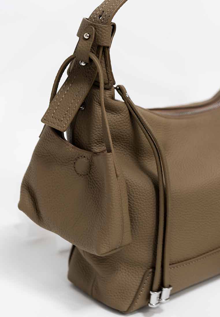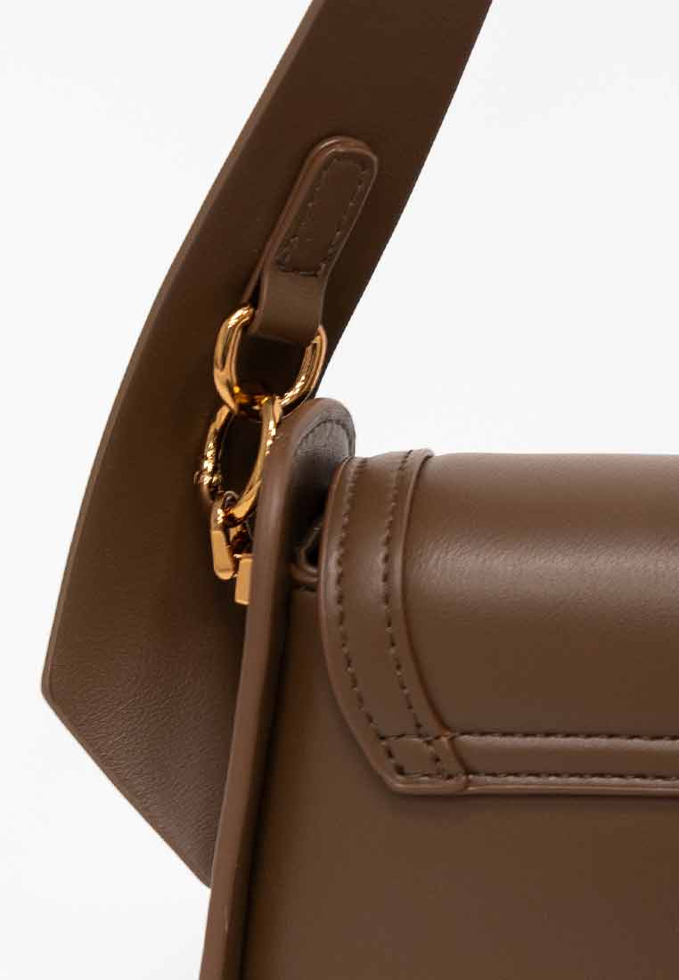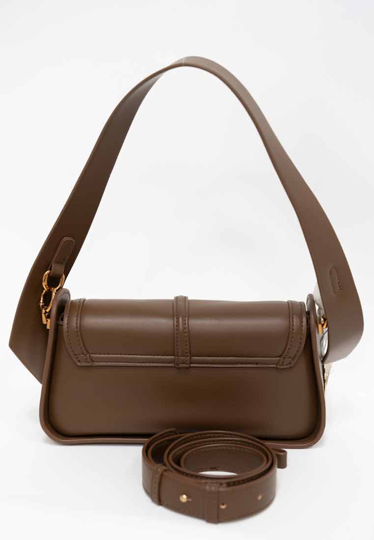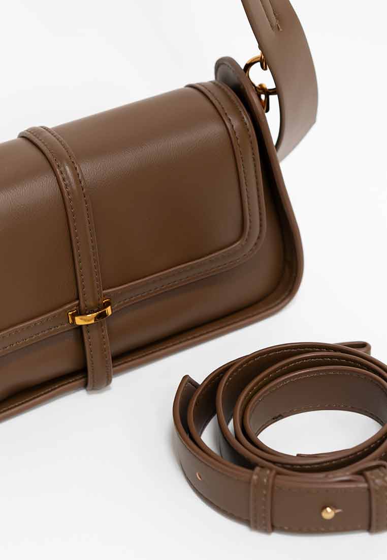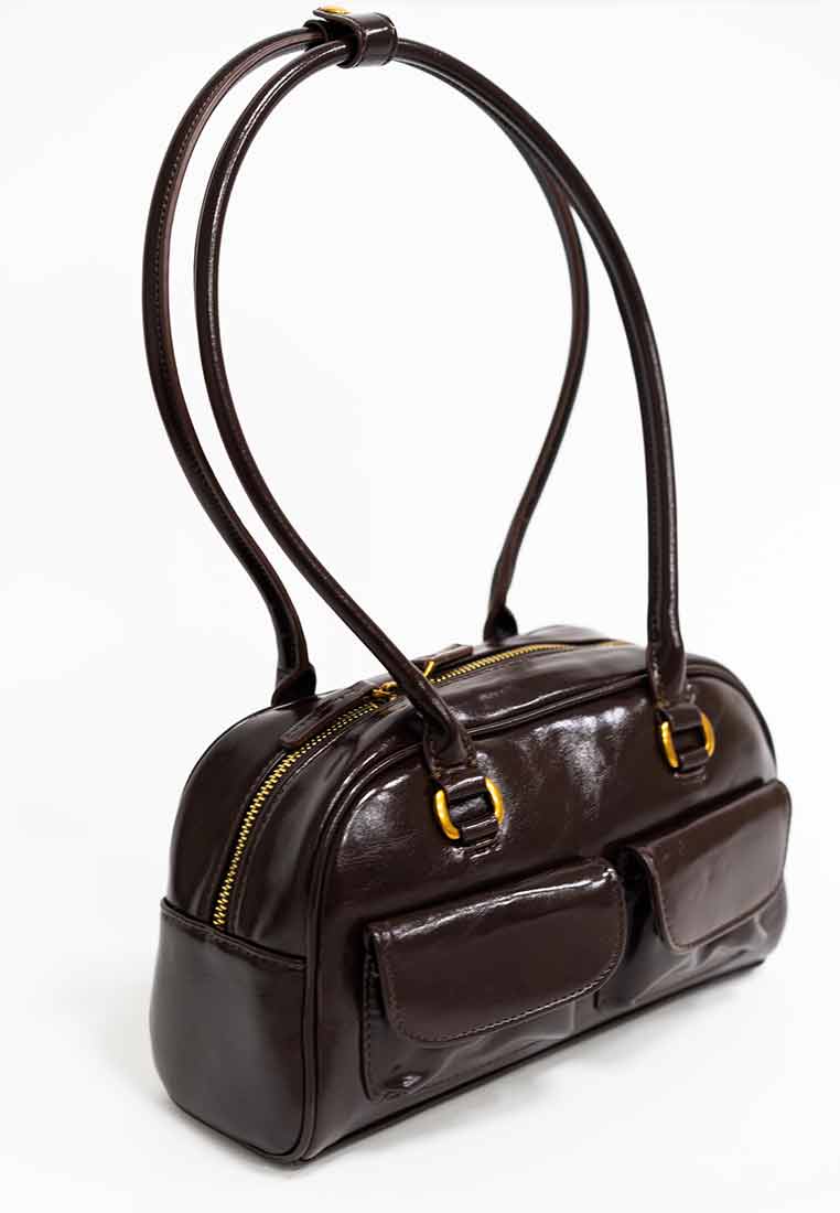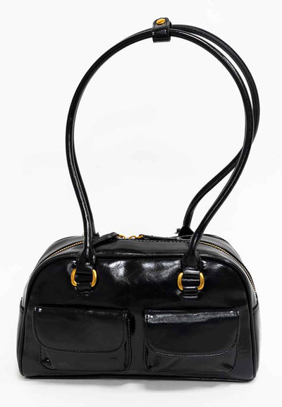 Details - Features a contrasting tan shoulder and handle straps, a large exterior tan panel with a functional gold-toned zipper pocket, and subtle gold-toned rivet accents.