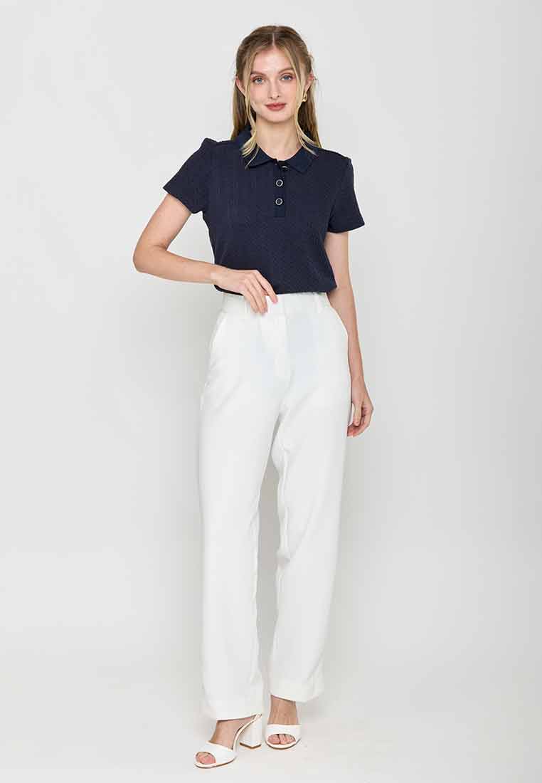 Classic with a twist. This plain knit top features a crisp collar and short sleeves, elevated by delicate scalloped edges for a fresh, feminine touch. Perfect for smart casual styling, it’s the kind of piece that stands out—without even trying.