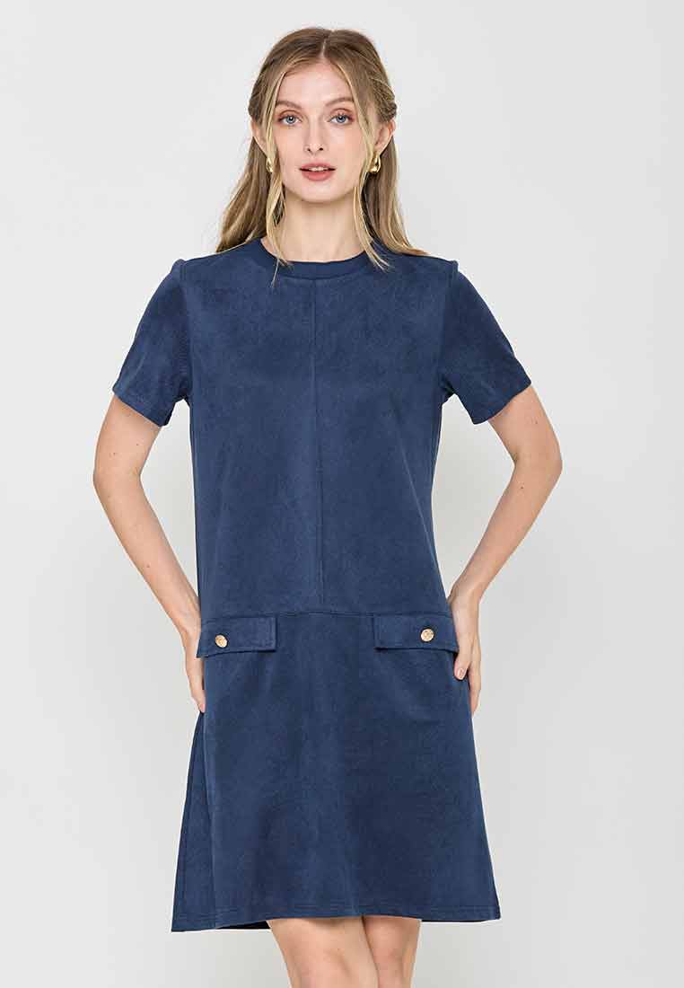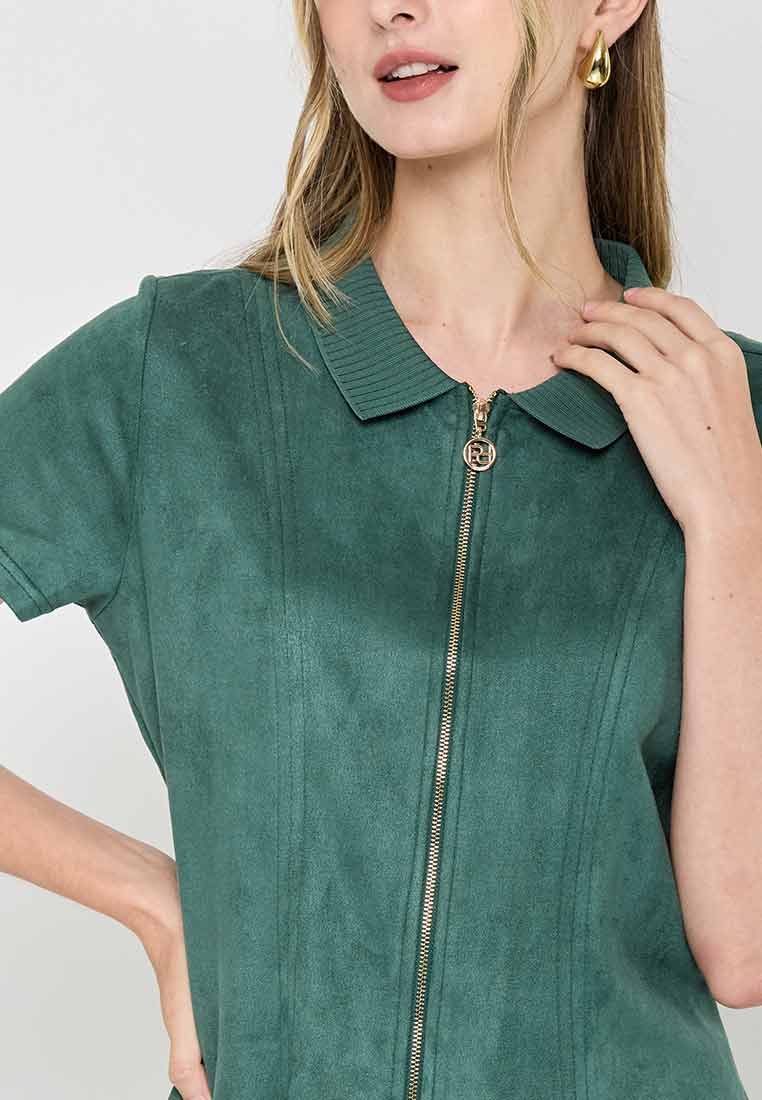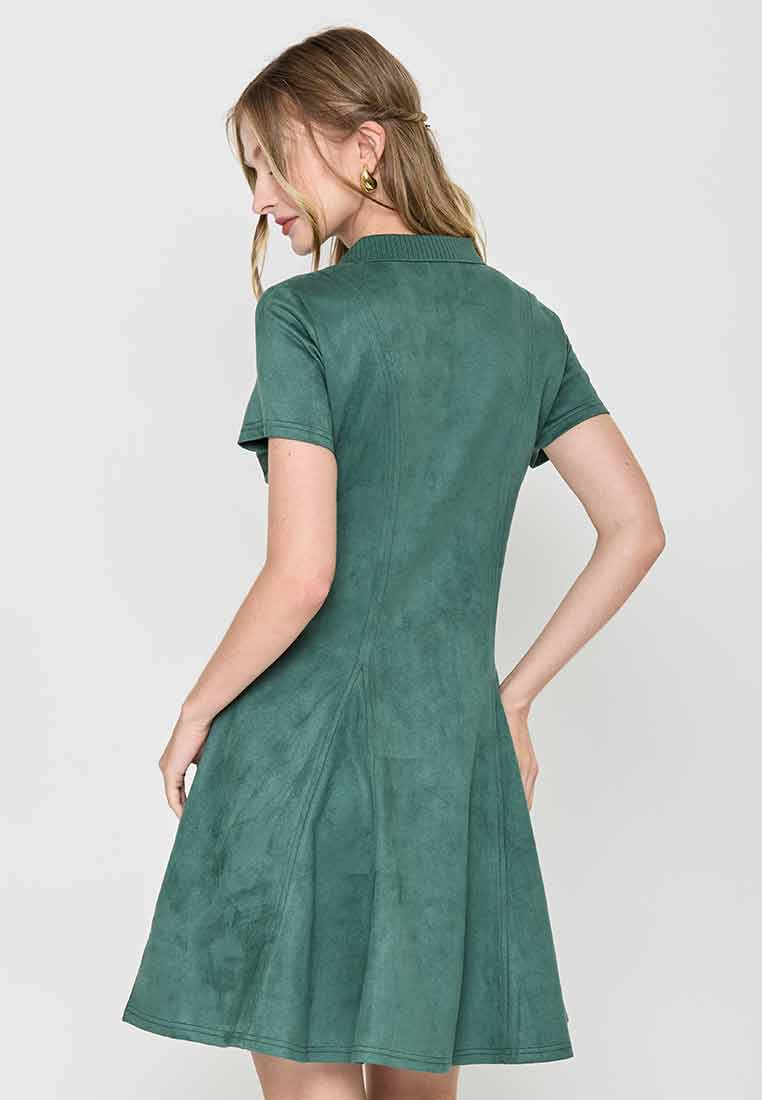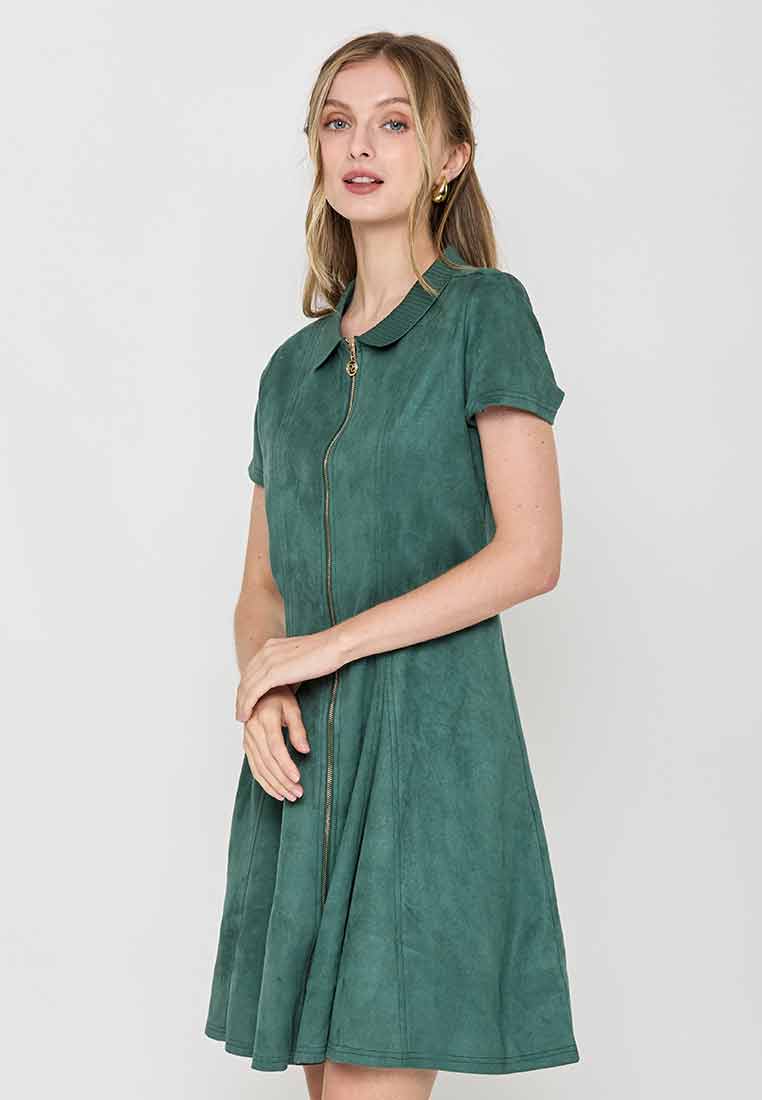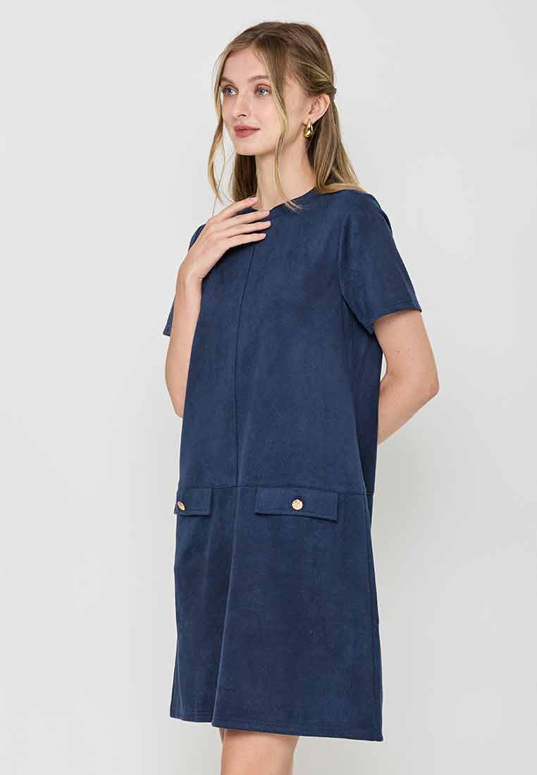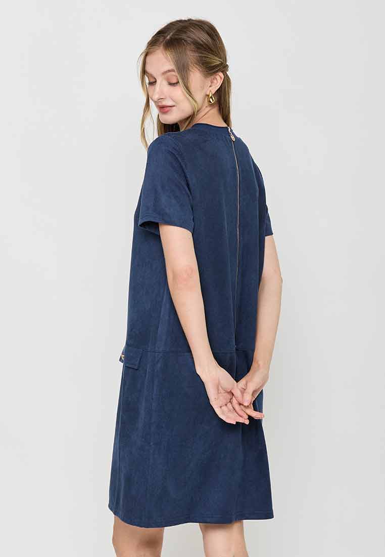 Details - V-neck with wide lapel/collar, short sleeves, decorative buttons on the front placket, removable matching belt, back zip closure (assumed)