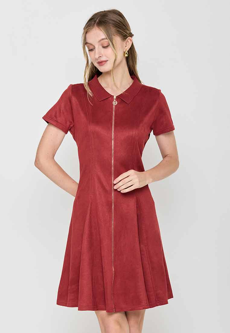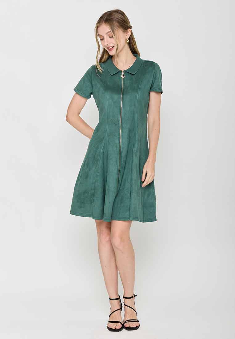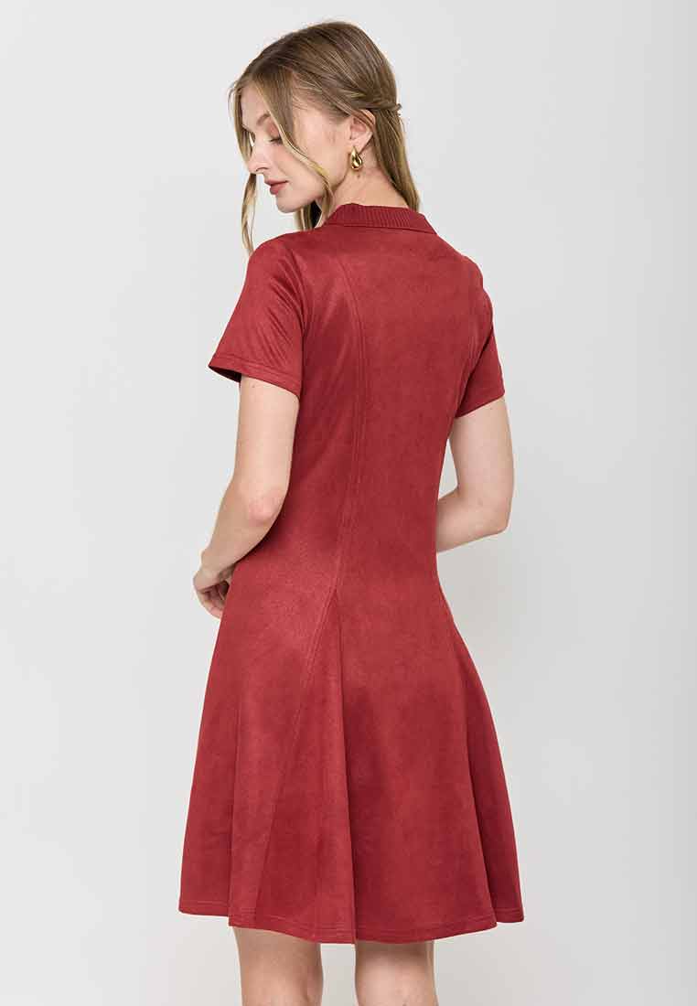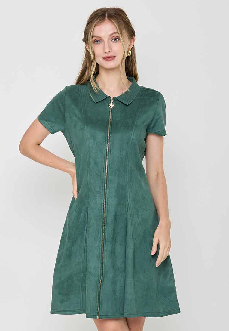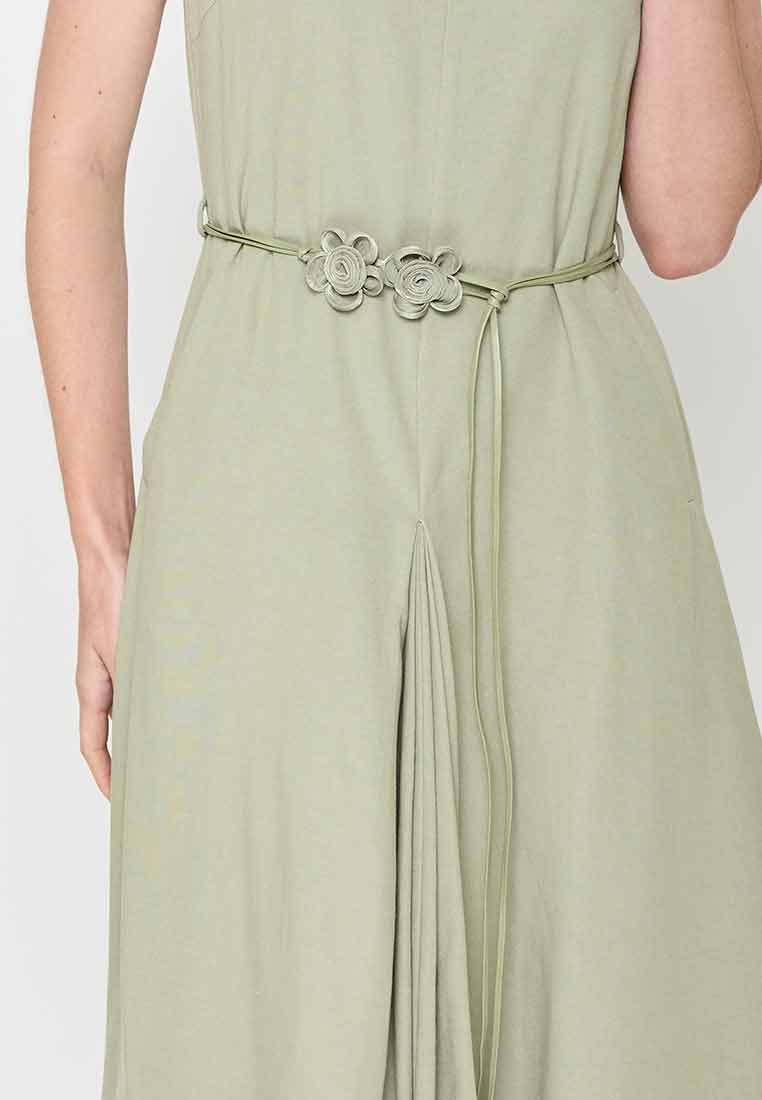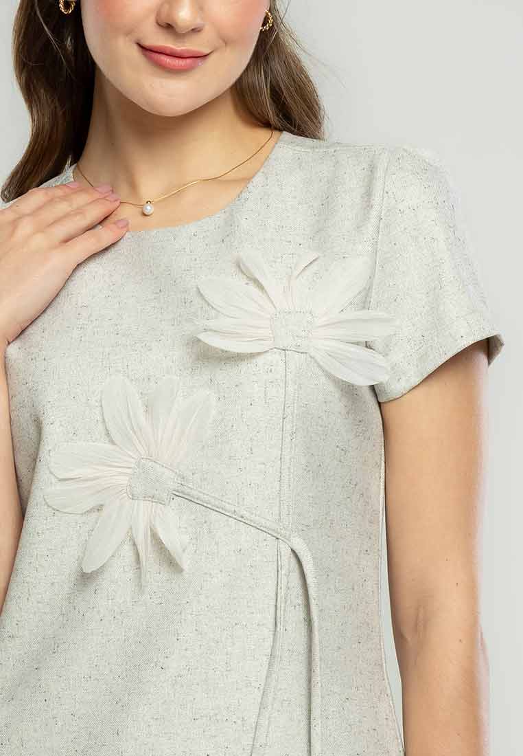 Details - V-neck with wide lapel/collar, short sleeves, decorative buttons on the front placket, removable matching belt, back zip closure (assumed)