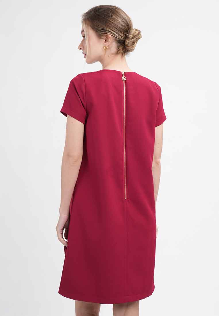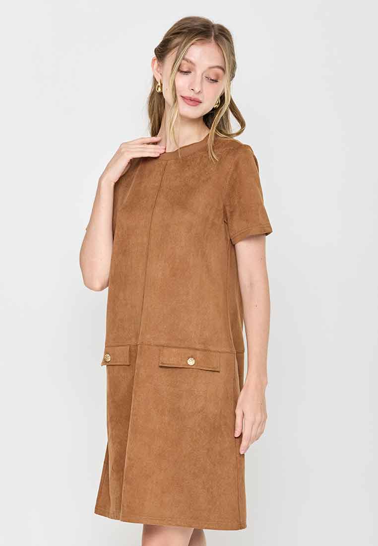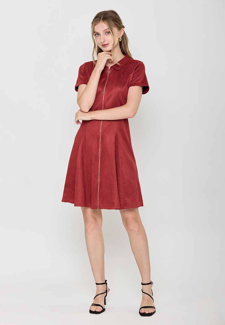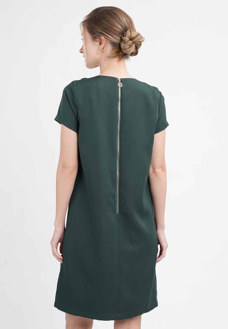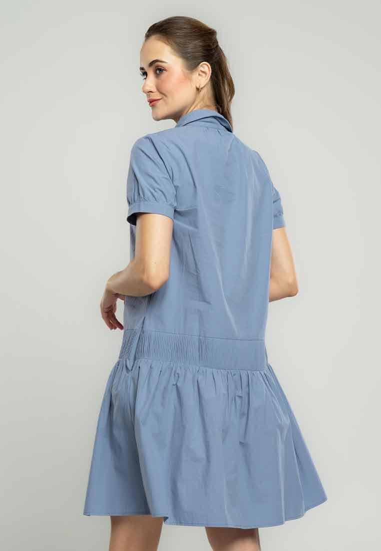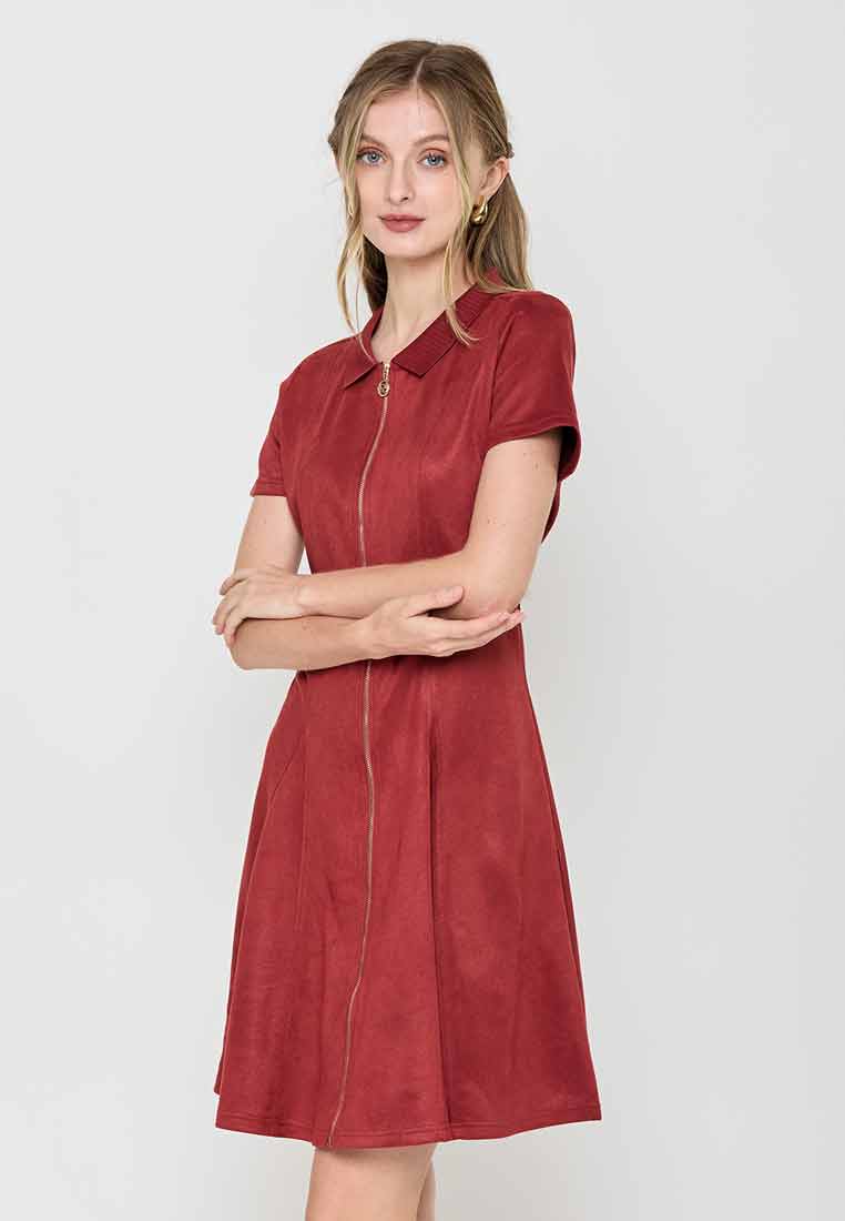 Details - V-neck with wide lapel/collar, short sleeves, decorative buttons on the front placket, removable matching belt, back zip closure (assumed)