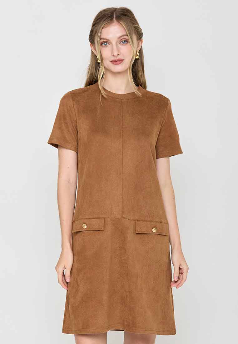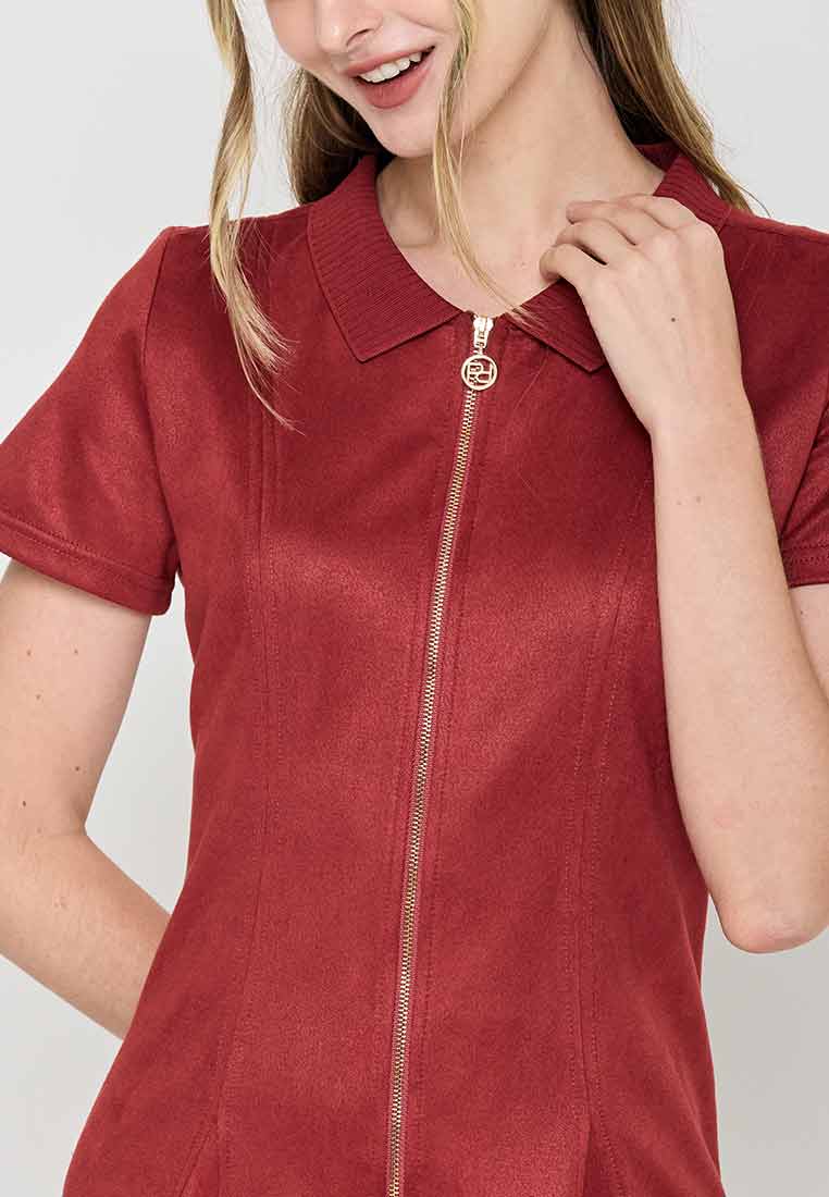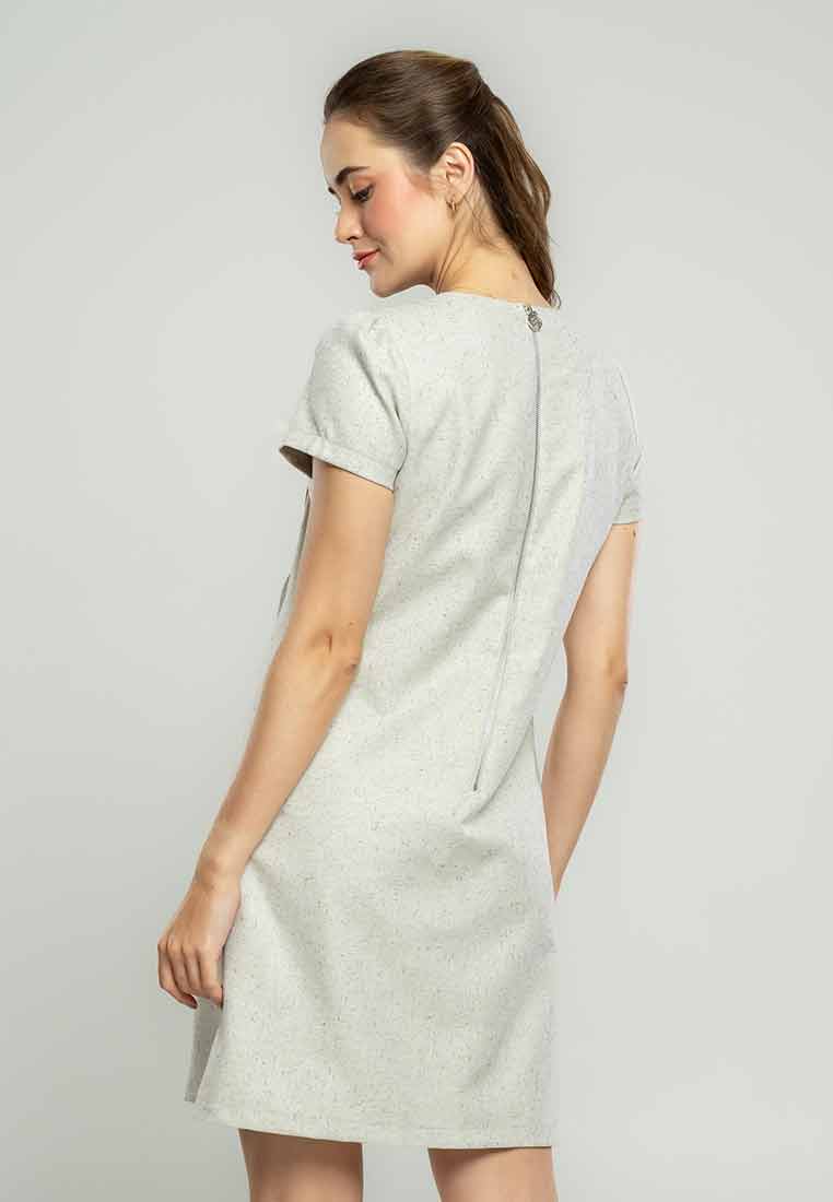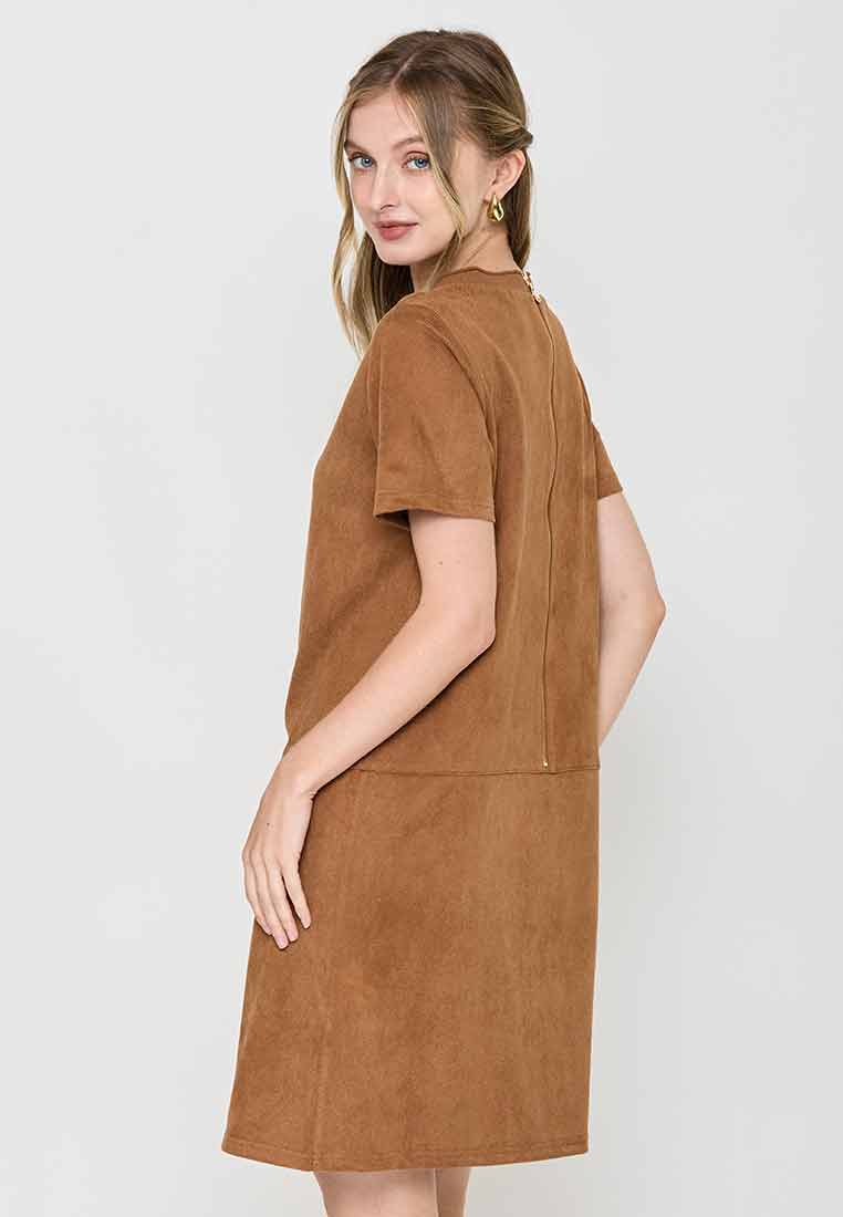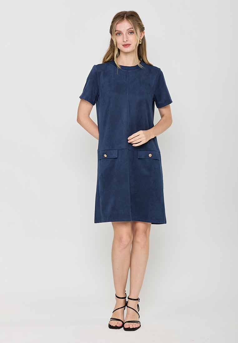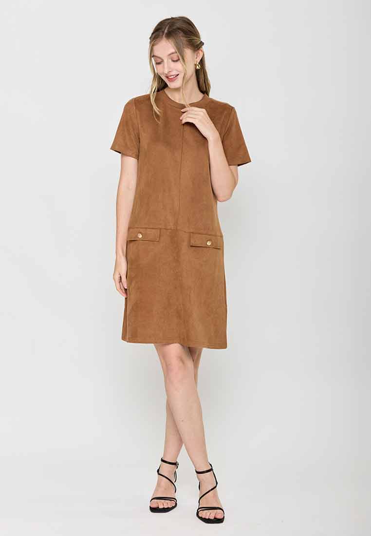 Details - V-neck with wide lapel/collar, short sleeves, decorative buttons on the front placket, removable matching belt, back zip closure (assumed)