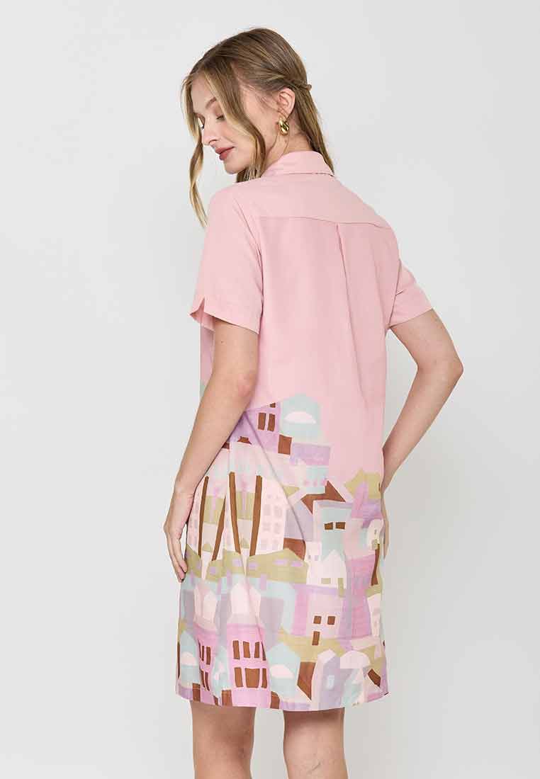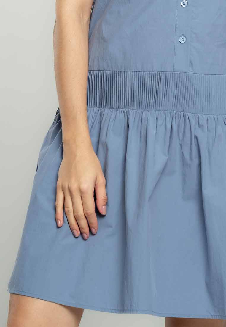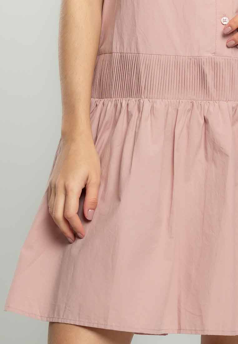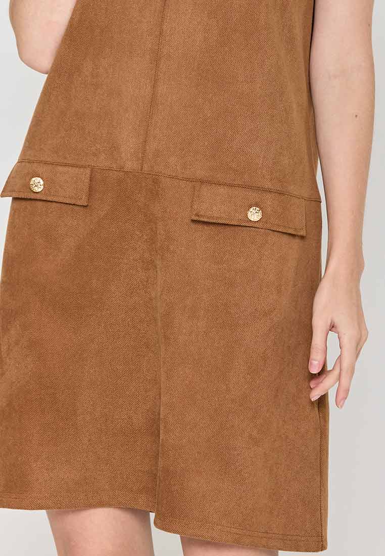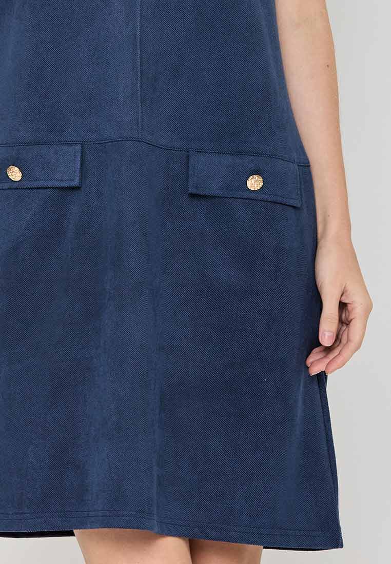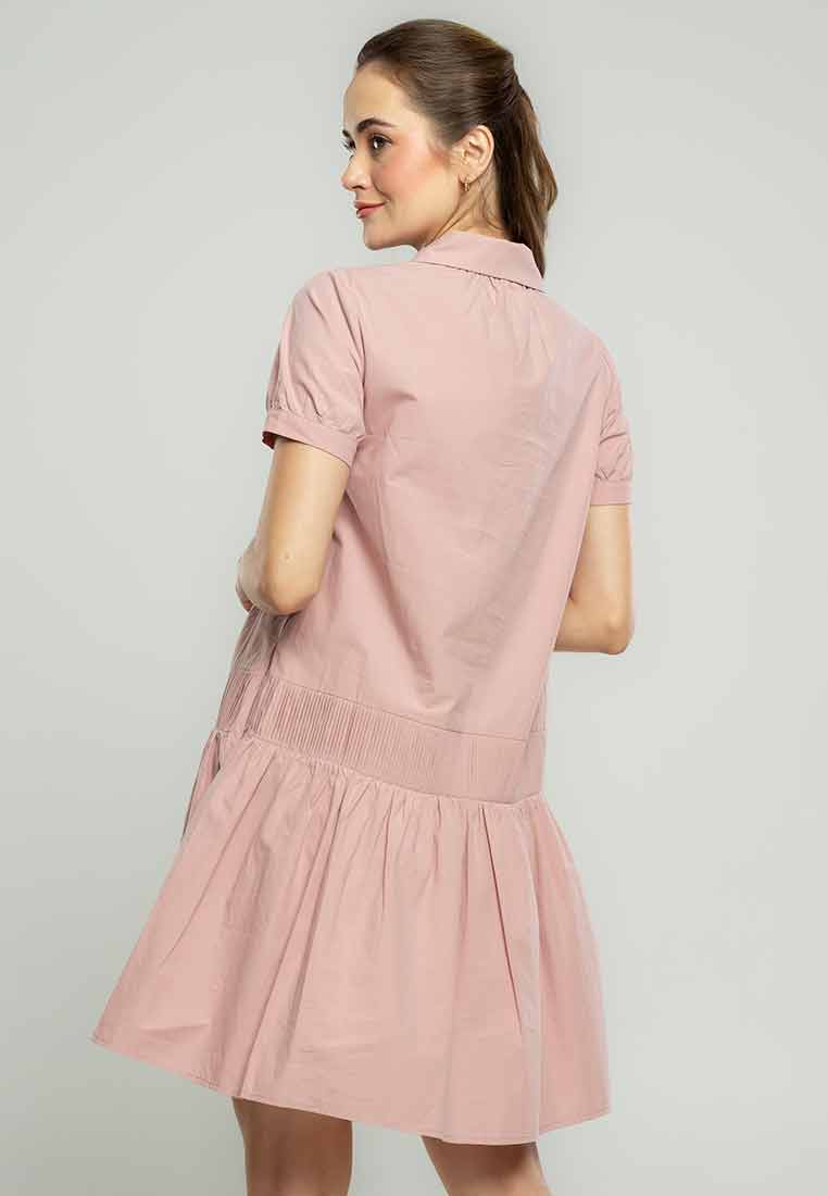 Details - V-neck with wide lapel/collar, short sleeves, decorative buttons on the front placket, removable matching belt, back zip closure (assumed)