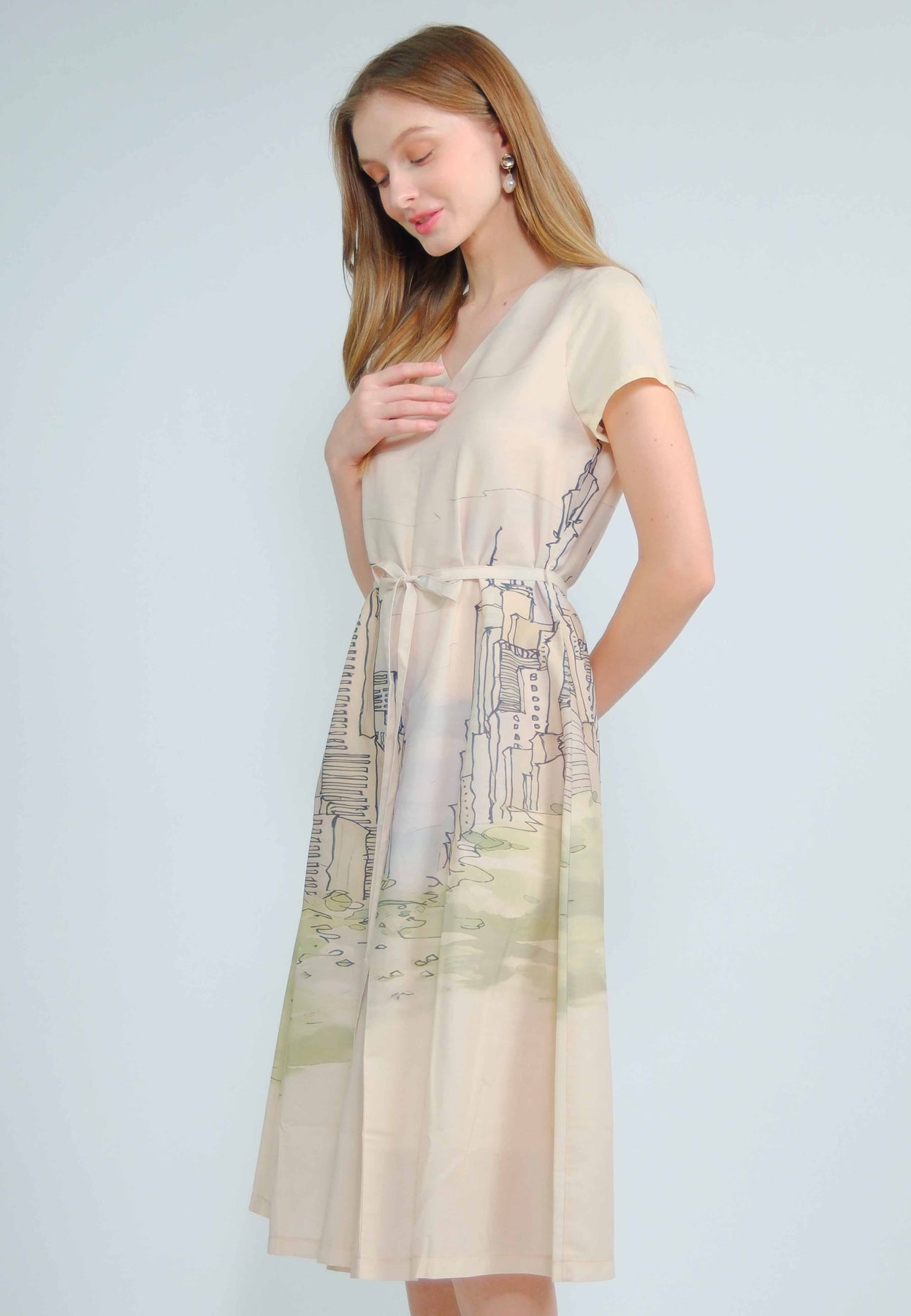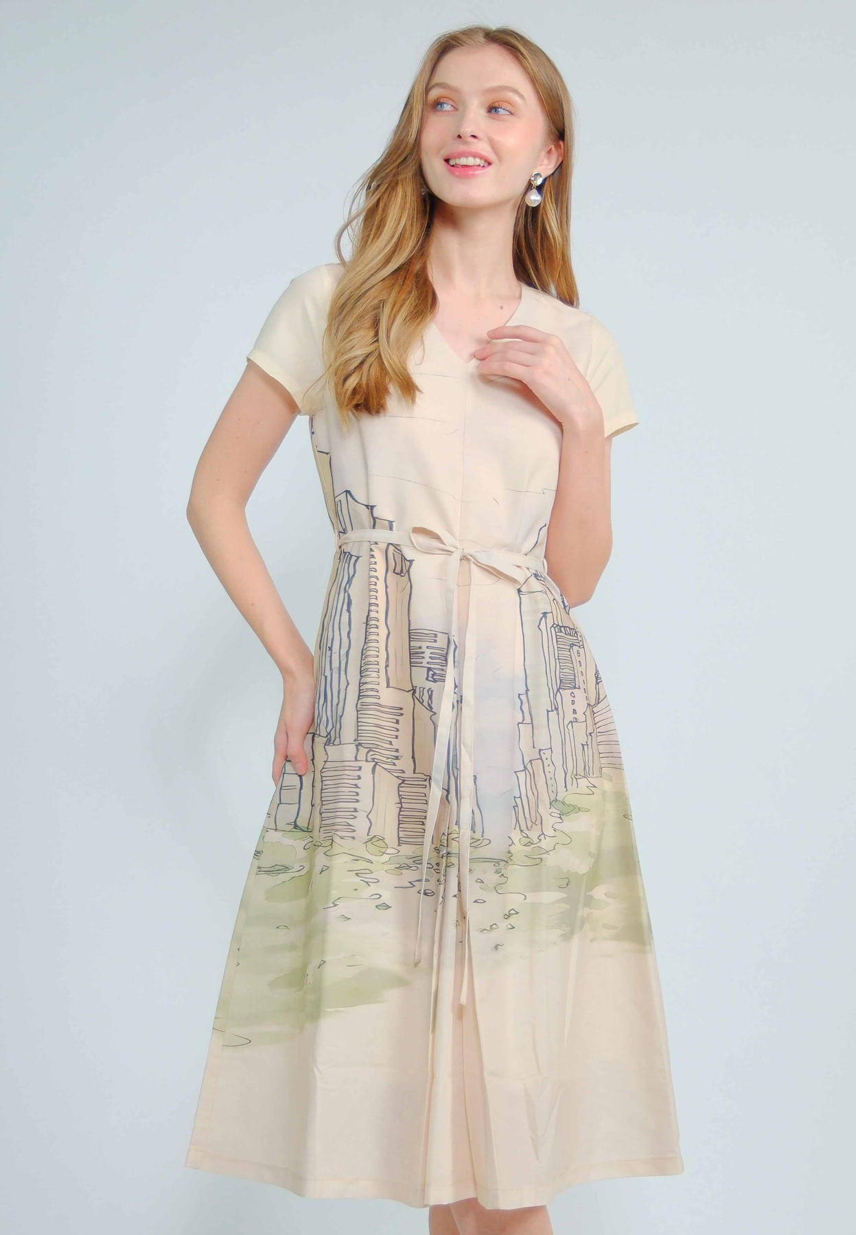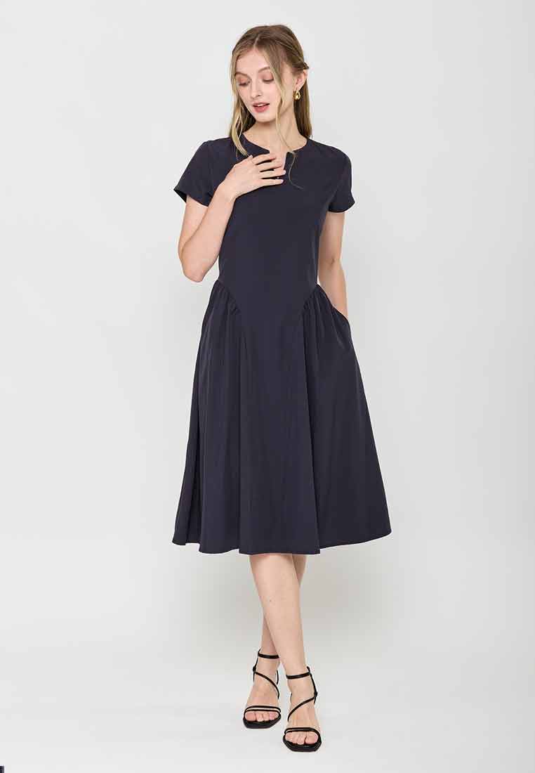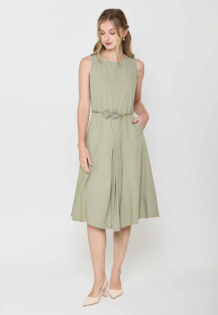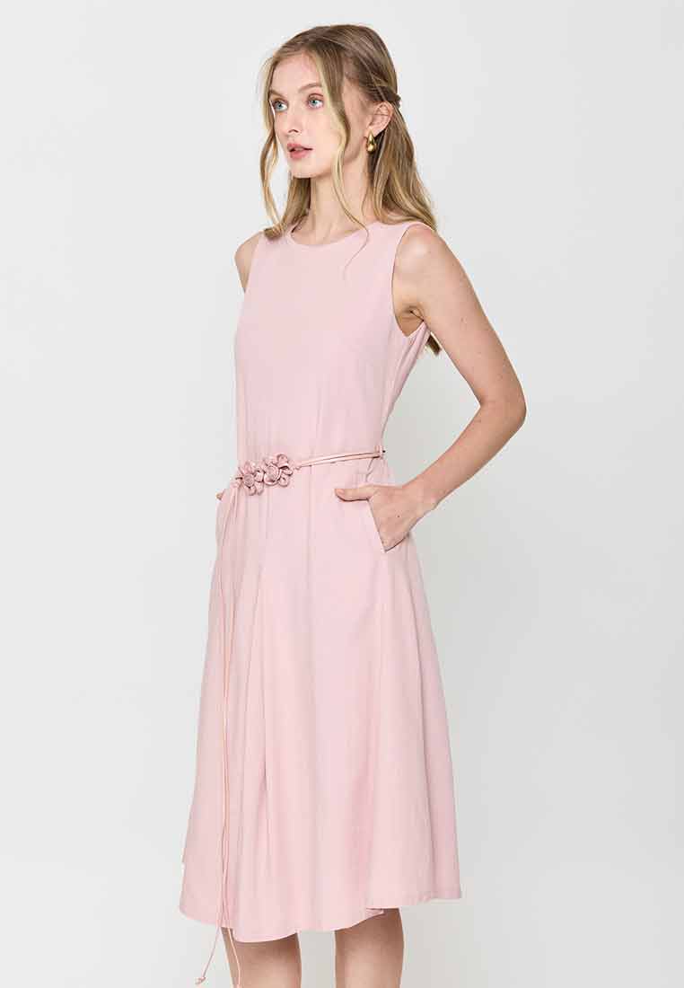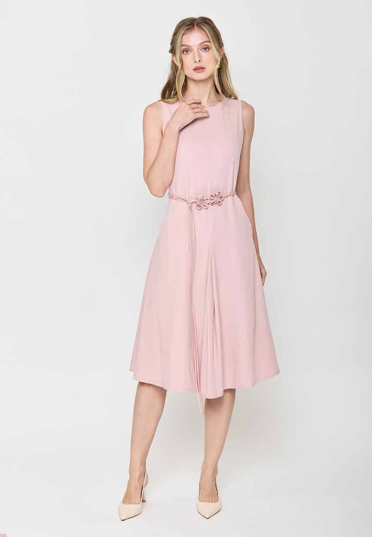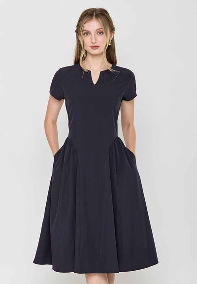 Fit - Fitted bodice, defined waist with belt, A-line skirt; Midi length