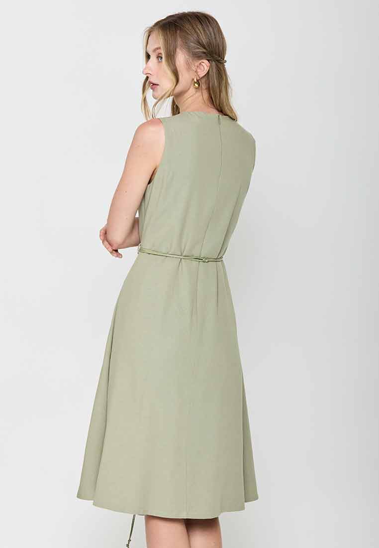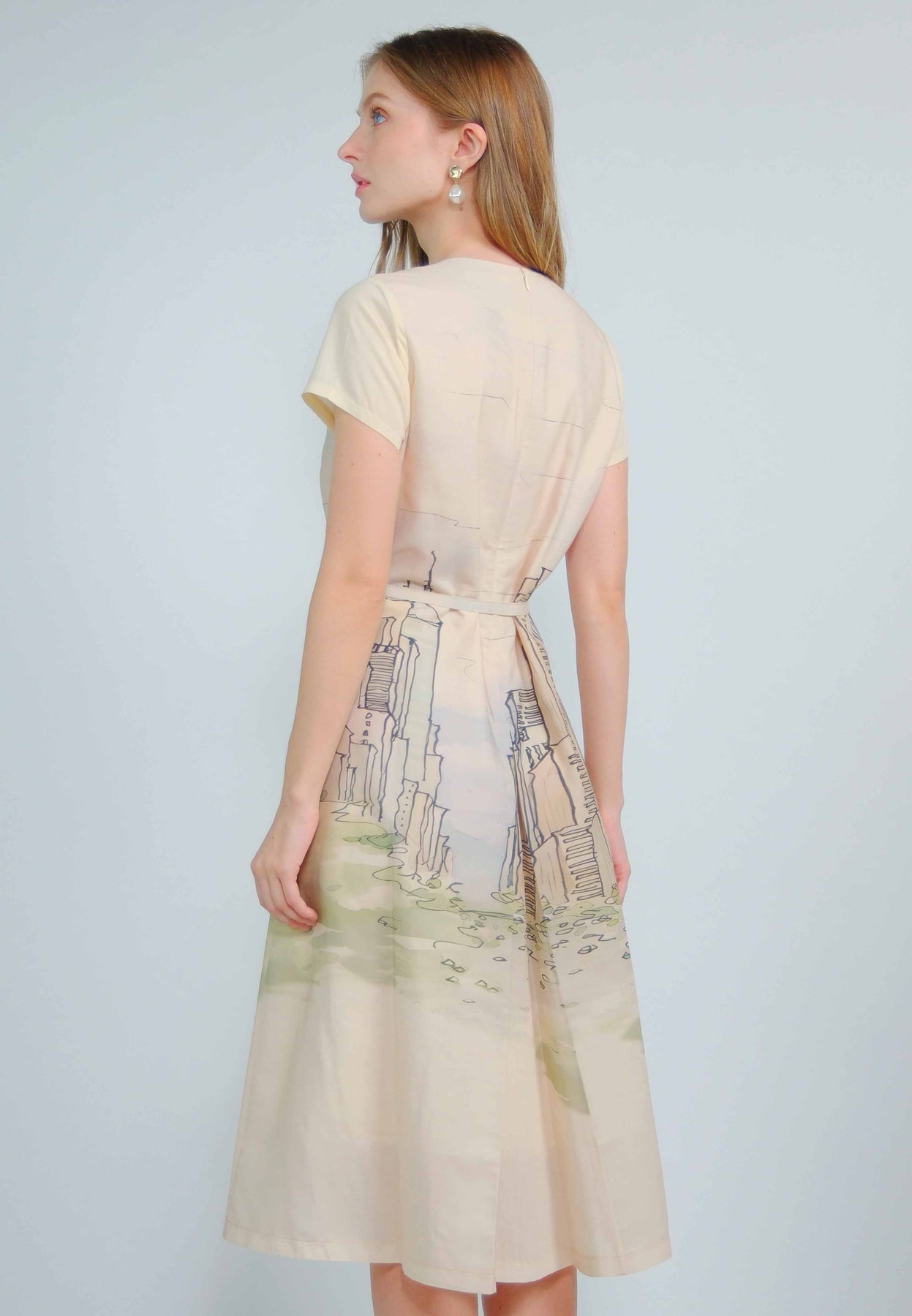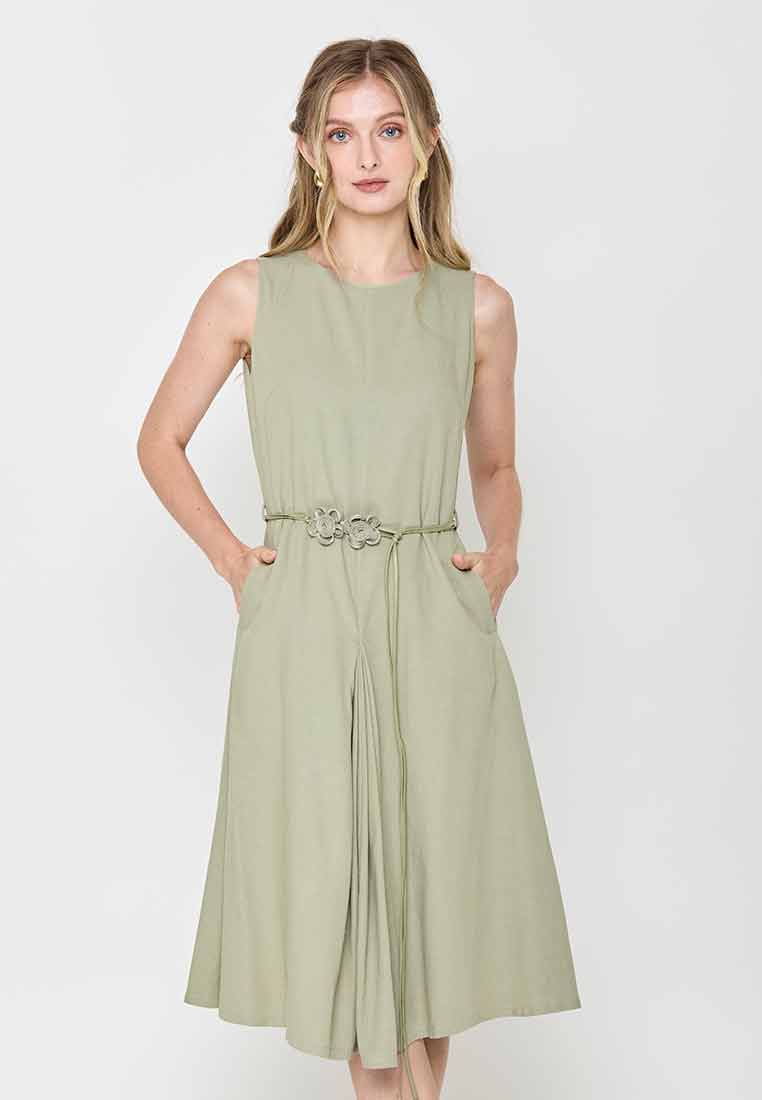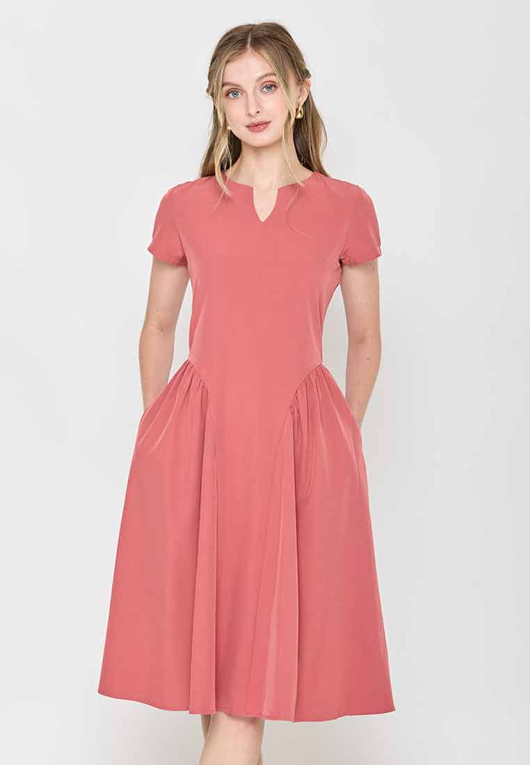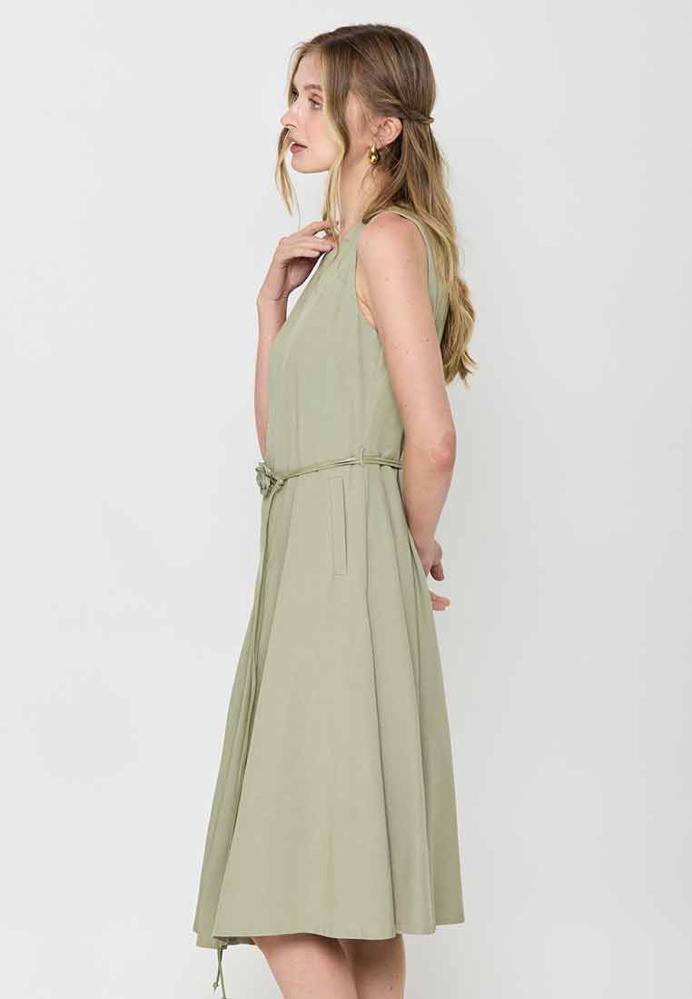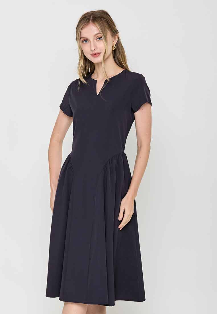 Fit - Fitted bodice, defined waist with belt, A-line skirt; Midi length