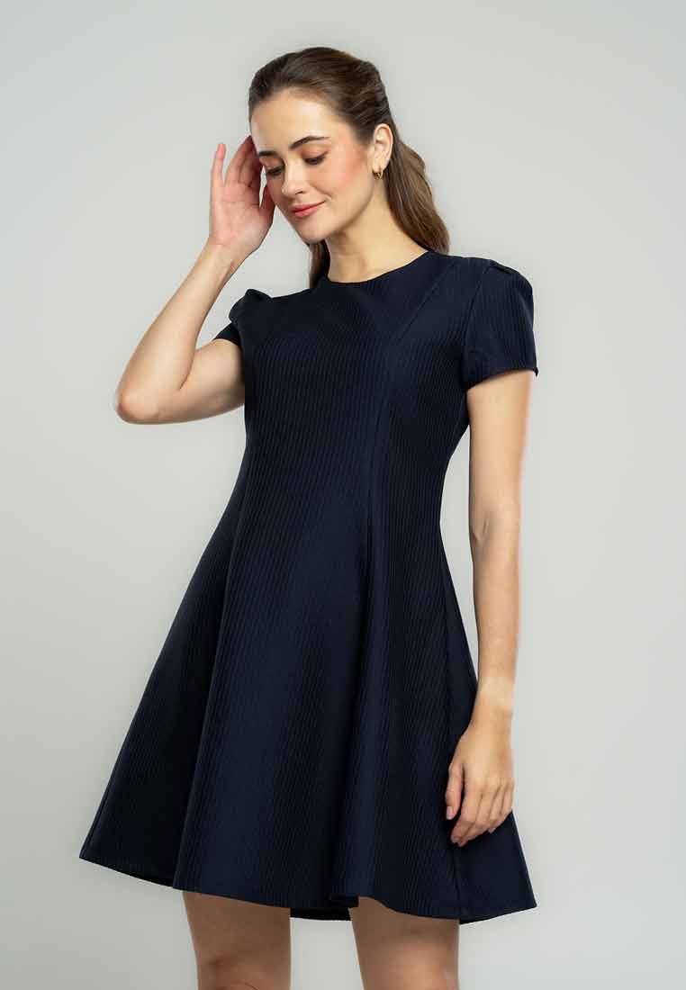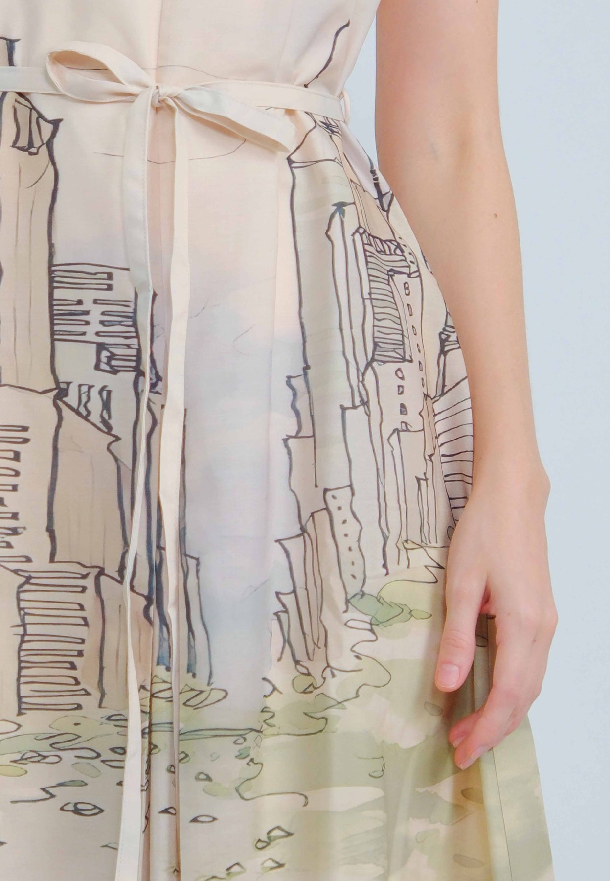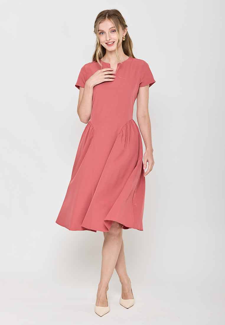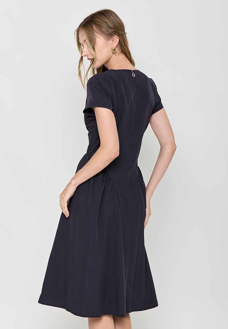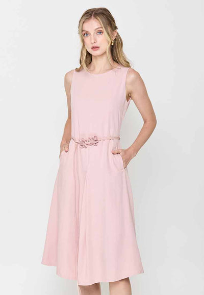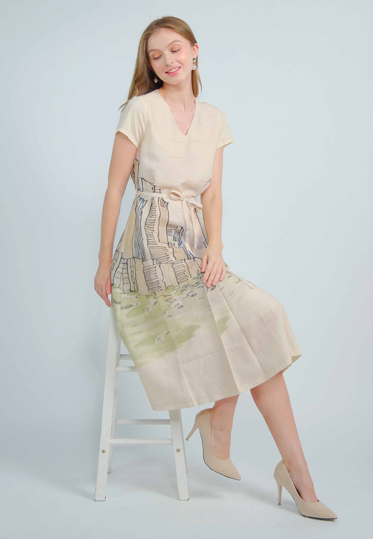 Fit - Fitted bodice, defined waist with belt, A-line skirt; Midi length