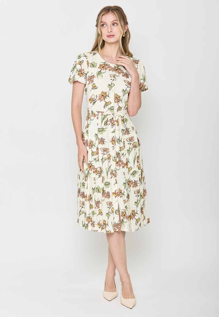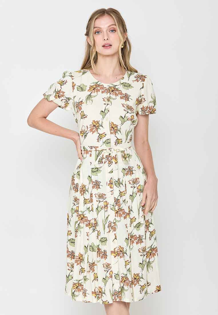 Meet the Zelina Vintage Floral Print A-Line Midi Dress—a charming and sophisticated dress that captures timeless femininity. This stunning piece features a beautiful all-over print of flowing flowers and vines on a light, creamy background. The design is highlighted by a flattering V-neckline accented with a chic, wide lapel collar and subtle button detailing on the bodice. It cinches at the waist with a removable self-fabric belt, flowing into a graceful, movement-friendly A-line midi skirt. This dress is perfect for occasions where you want to look polished, from special lunches to semi-formal daytime events.