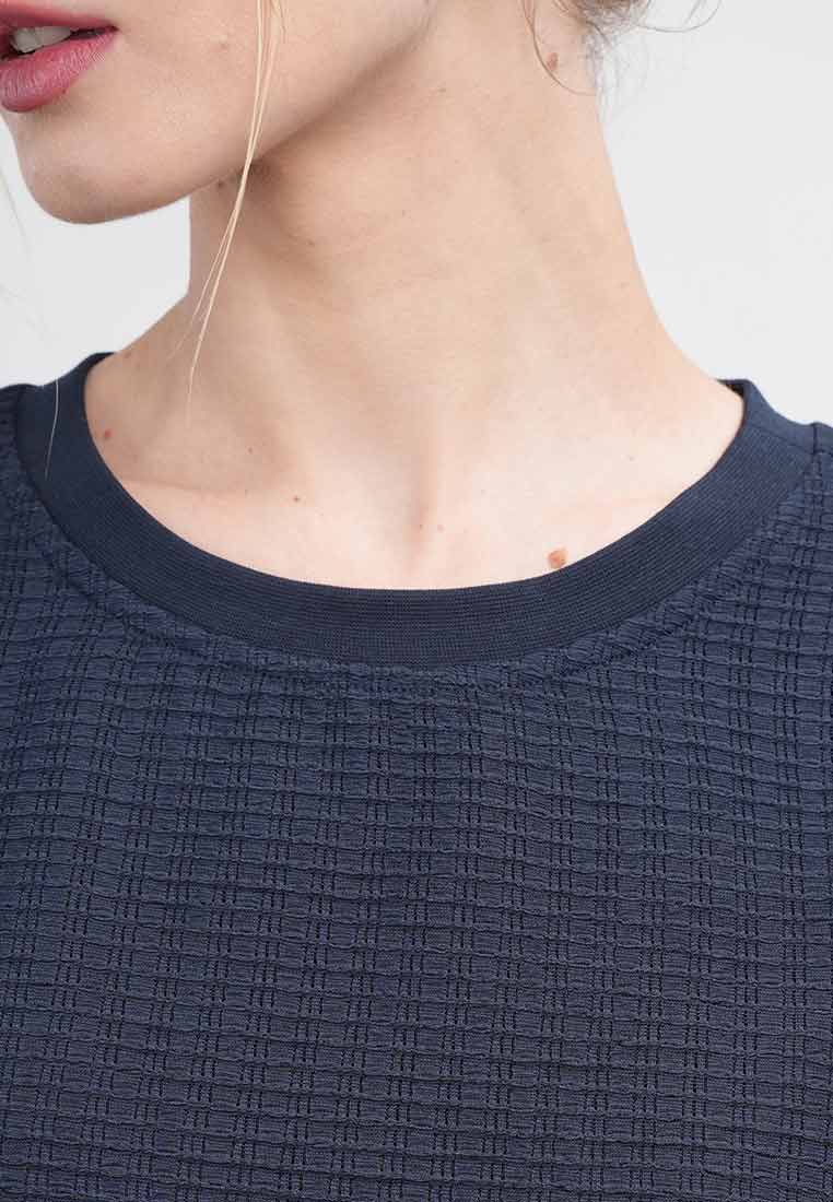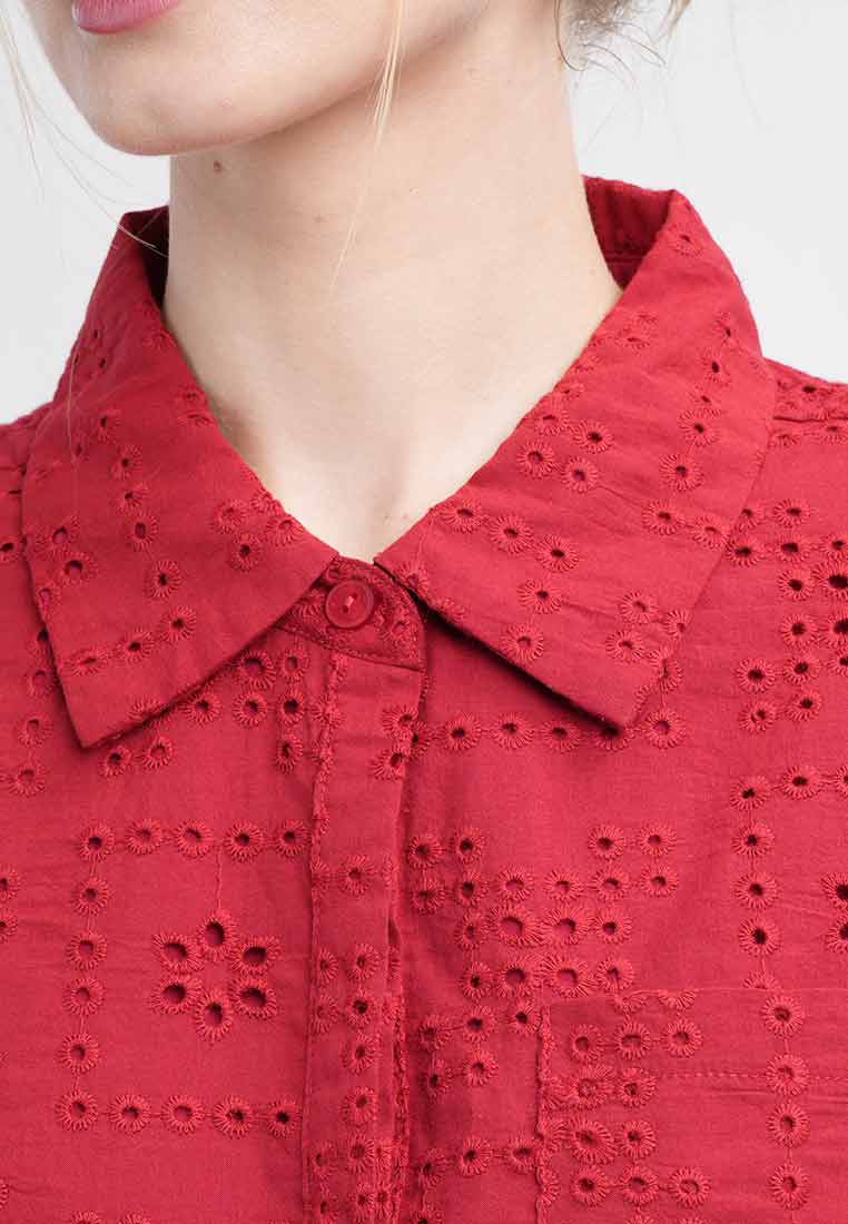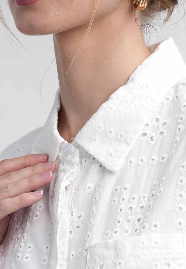 Details - Crew neckline, long sleeves, full button-down front closure, contrasting wood-look buttons, and two large front patch pockets