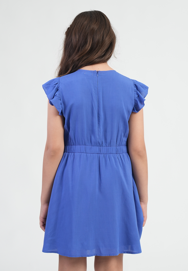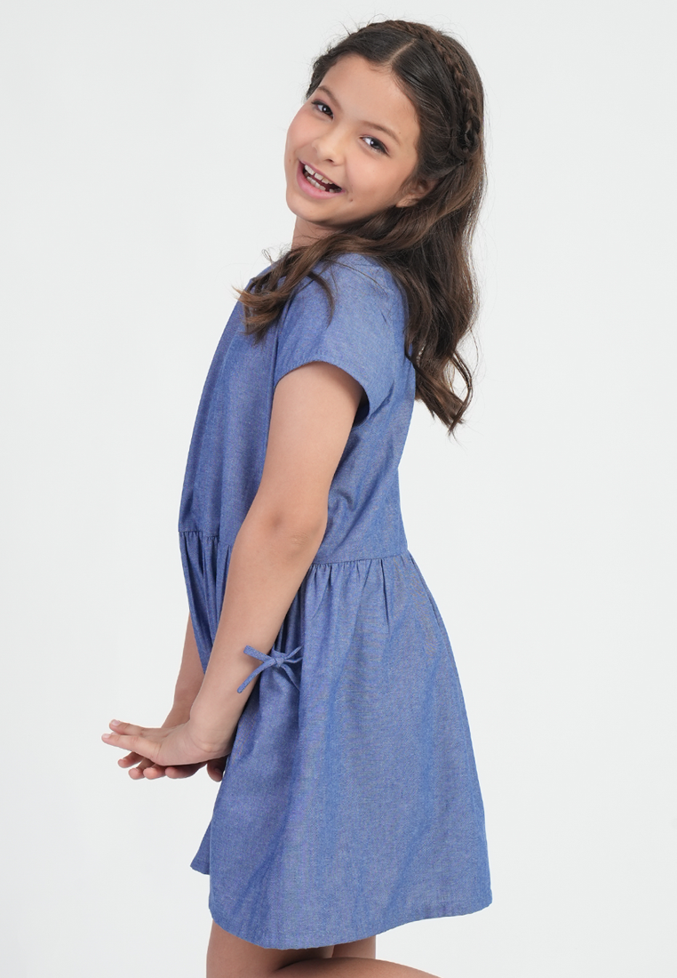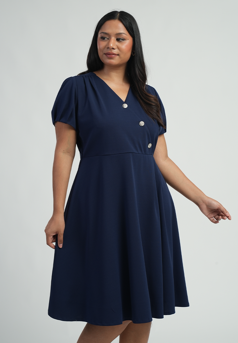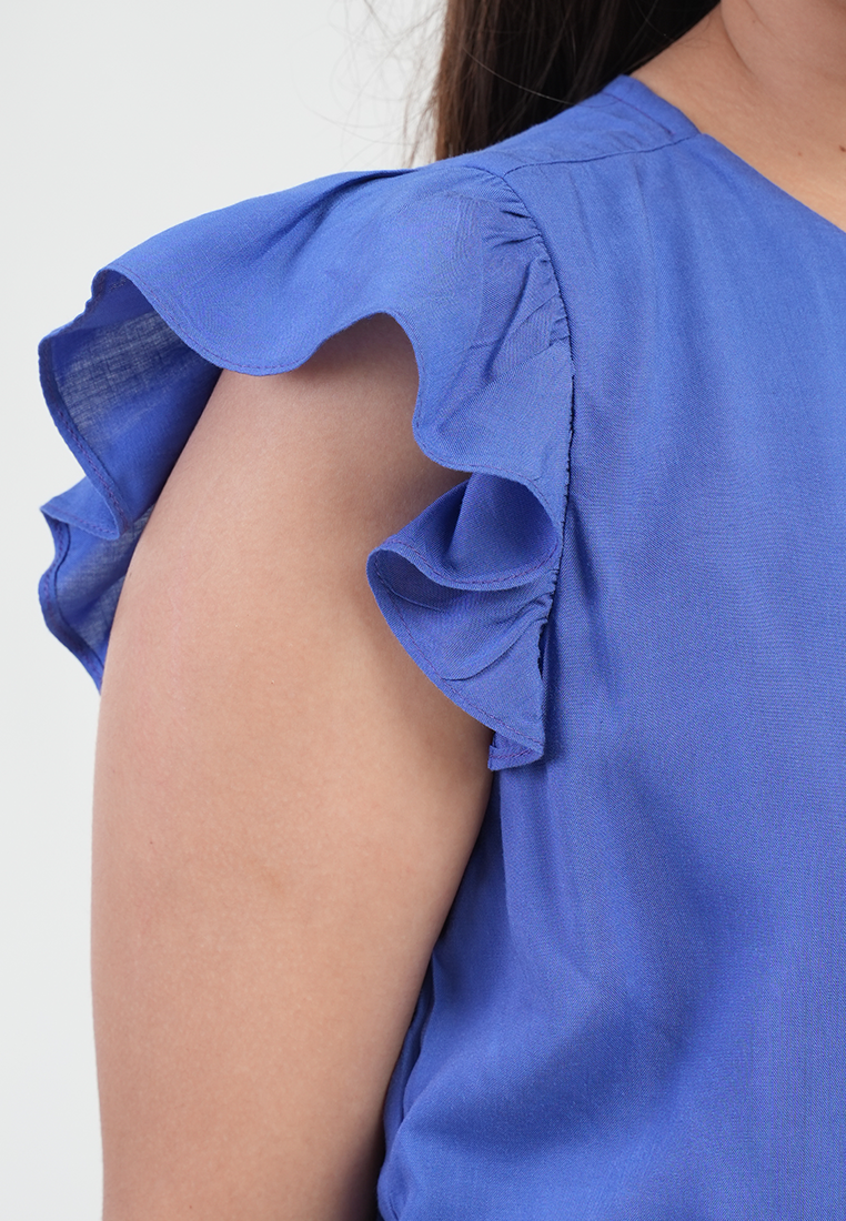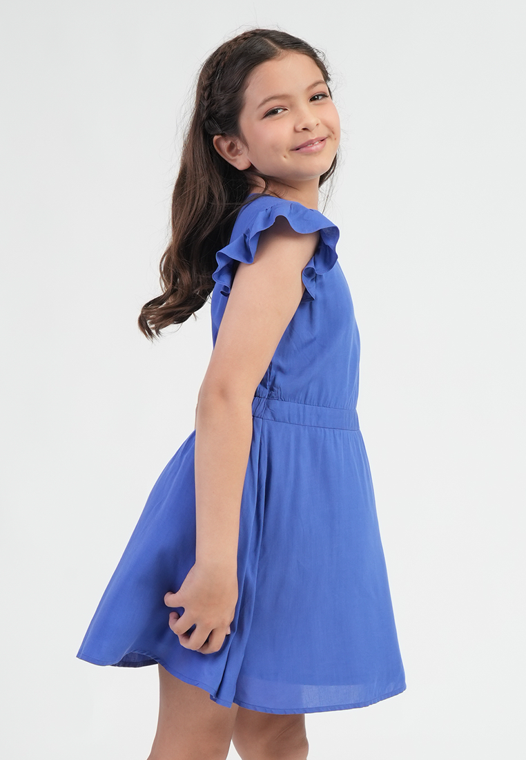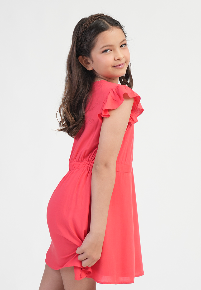 Details - V-neckline with ruffle collar detail, short sleeves, button-down front bodice, and a tiered hemline