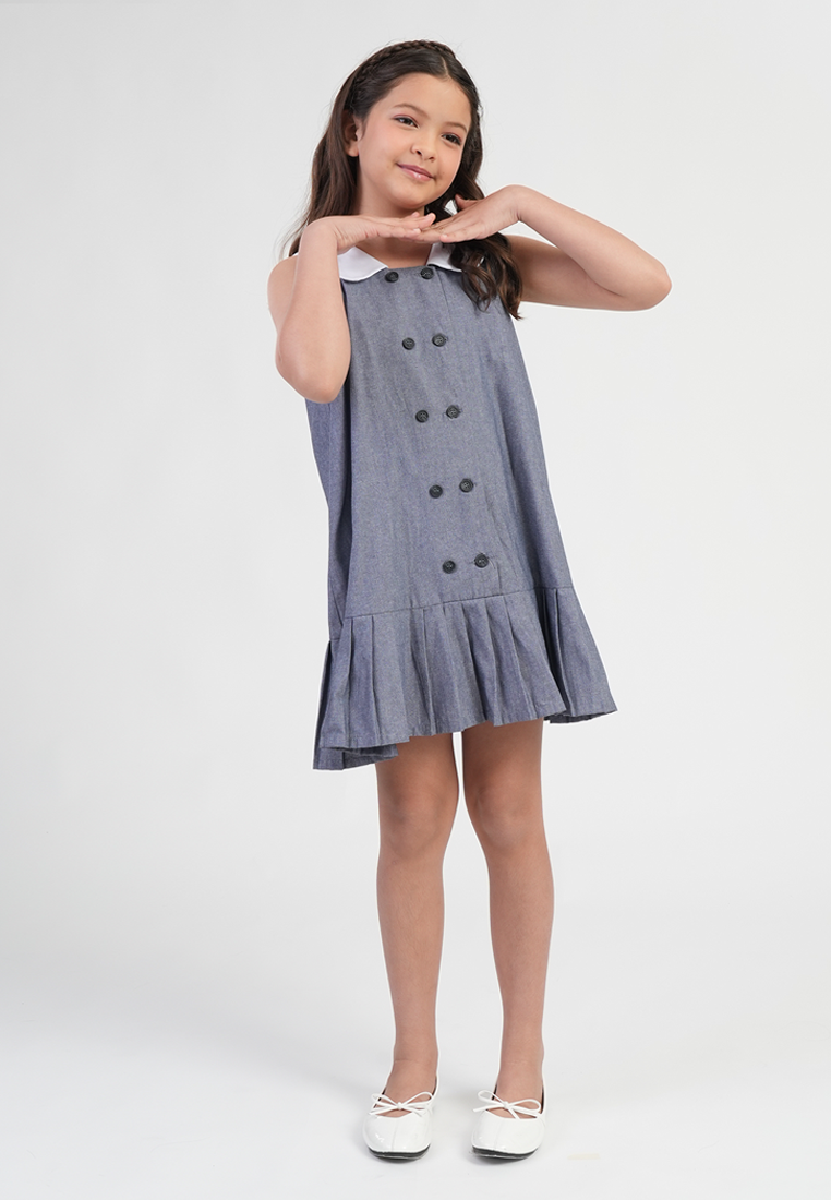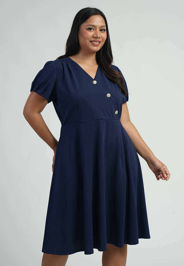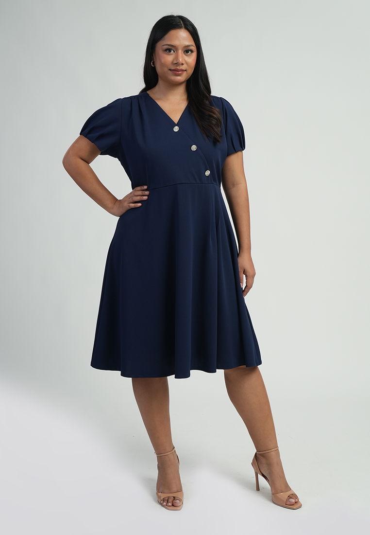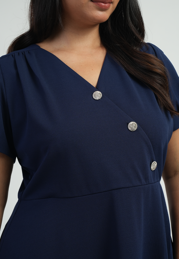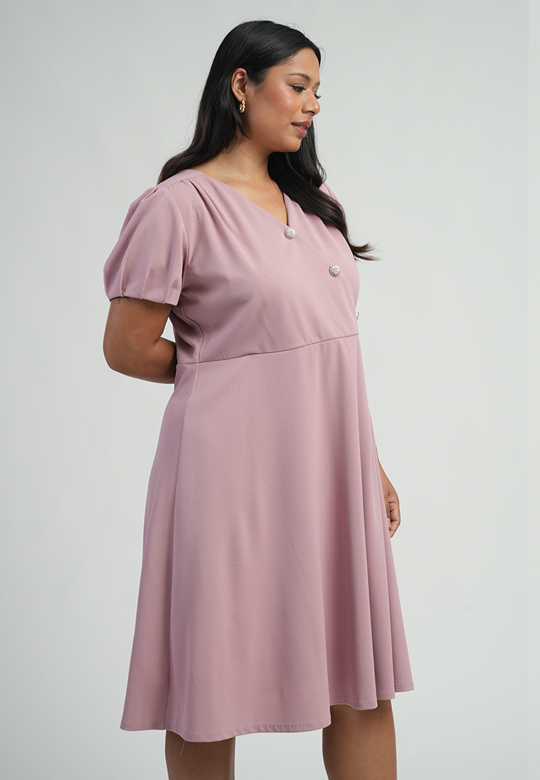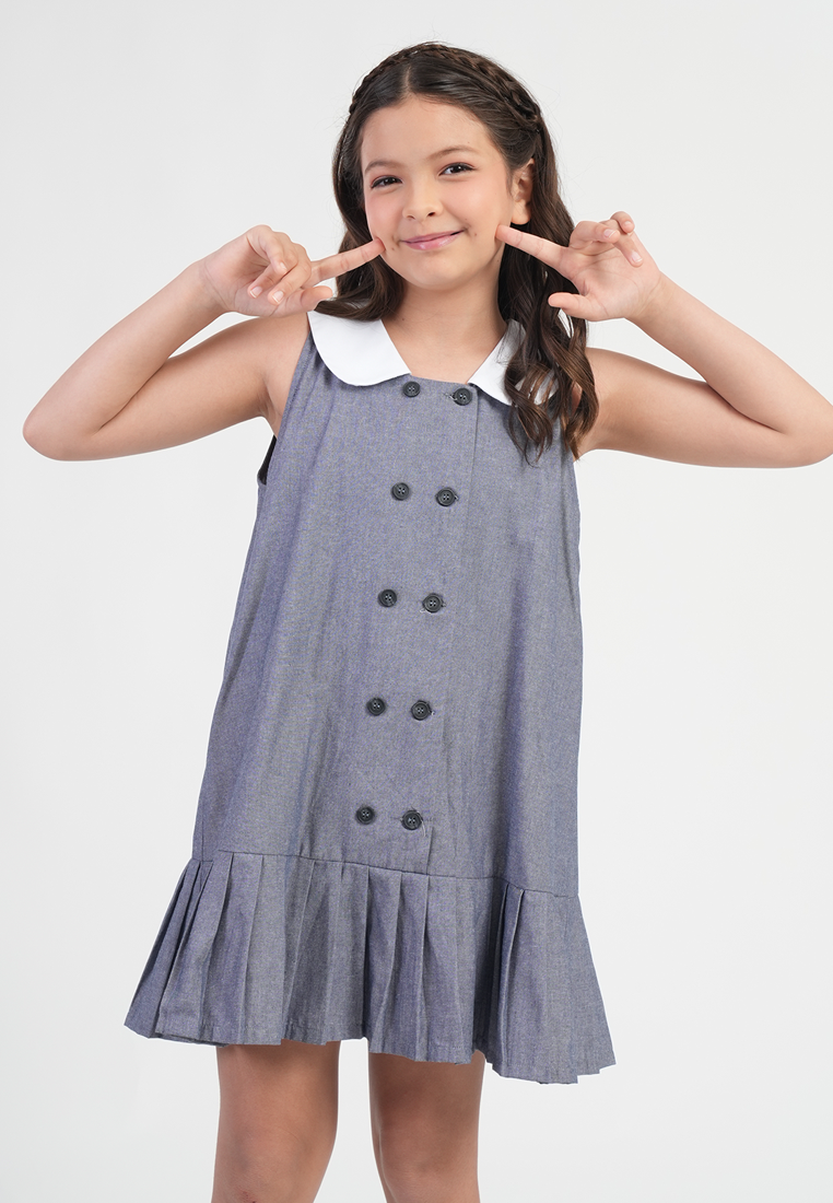 Details - V-neckline with ruffle collar detail, short sleeves, button-down front bodice, and a tiered hemline