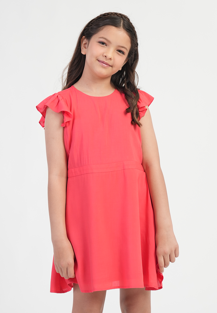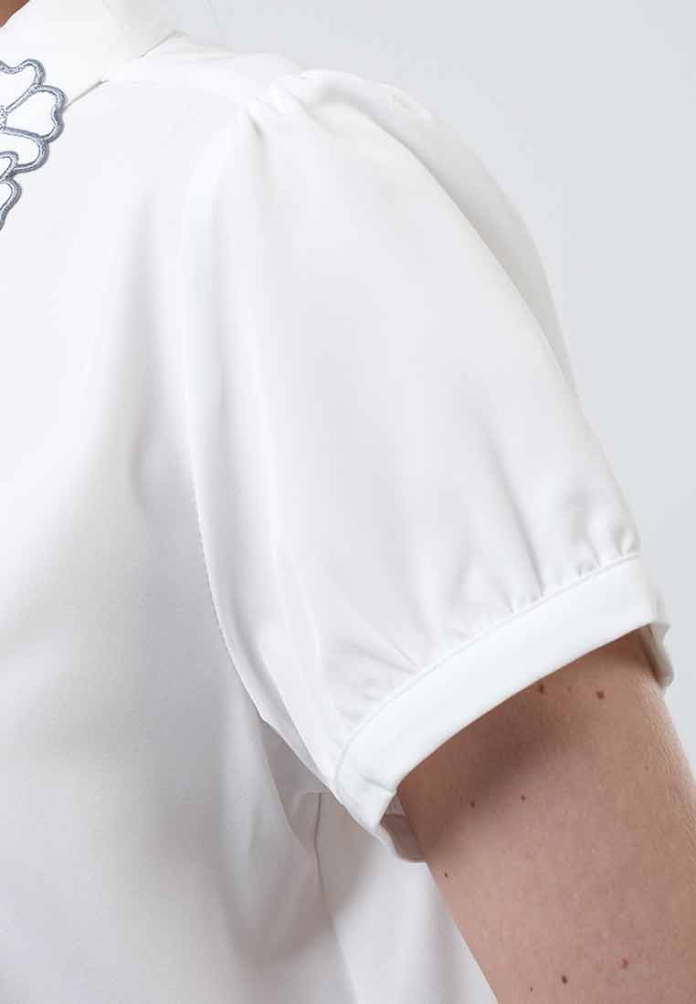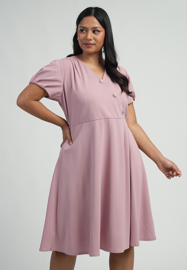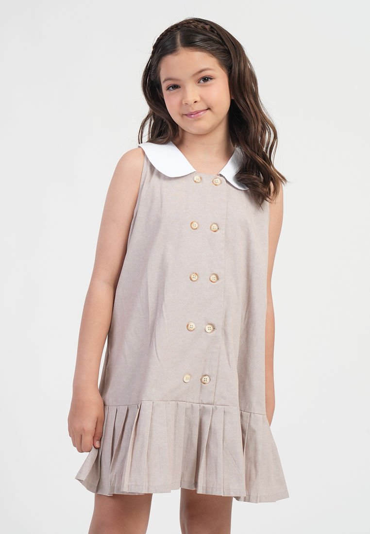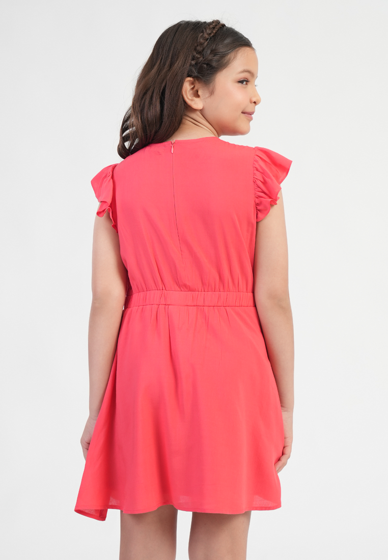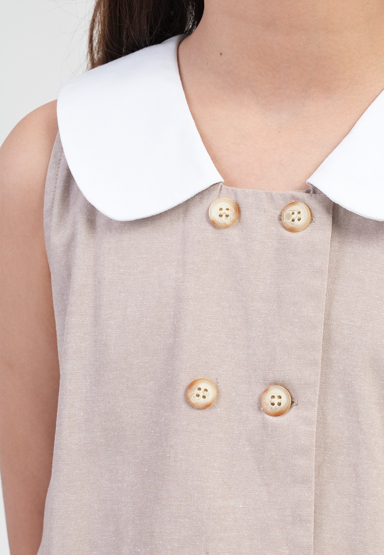 Details - V-neckline with ruffle collar detail, short sleeves, button-down front bodice, and a tiered hemline