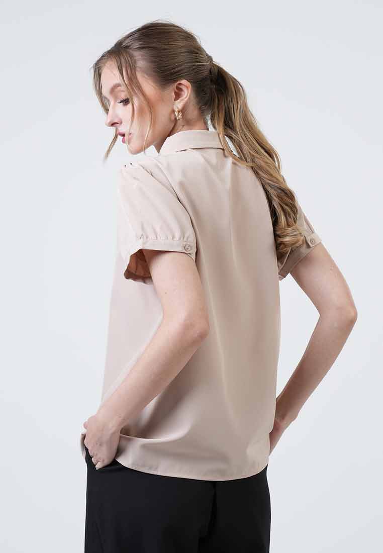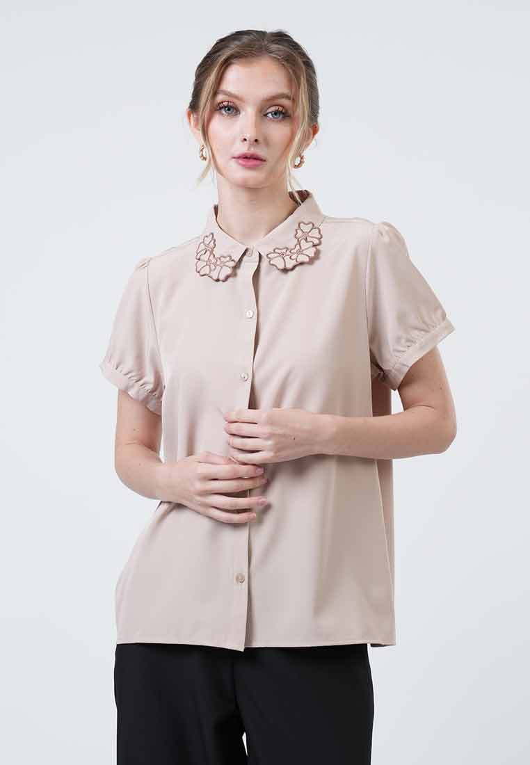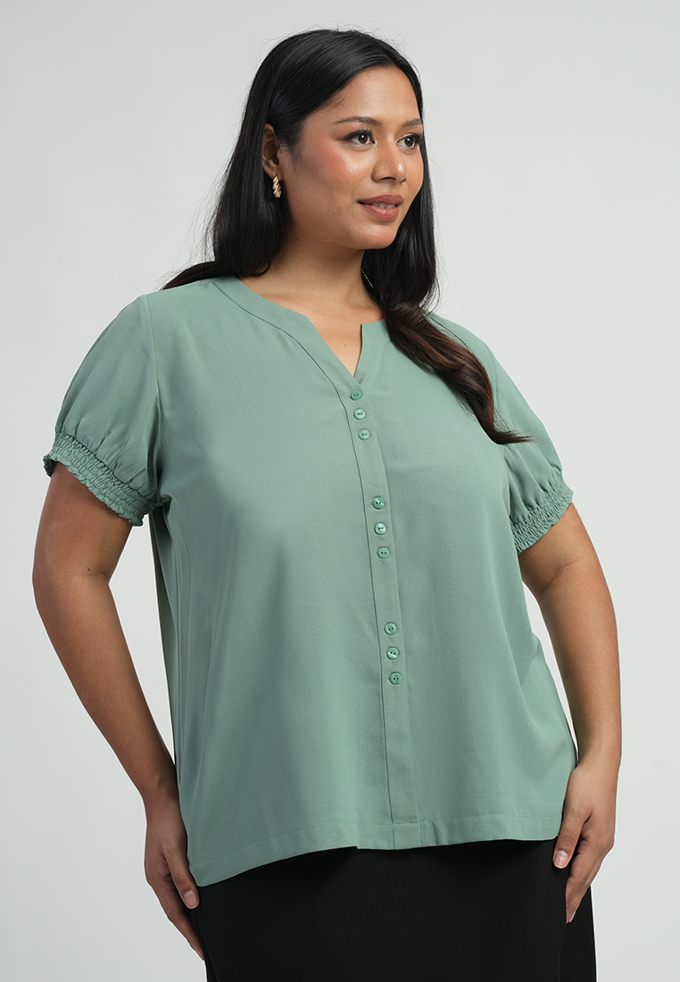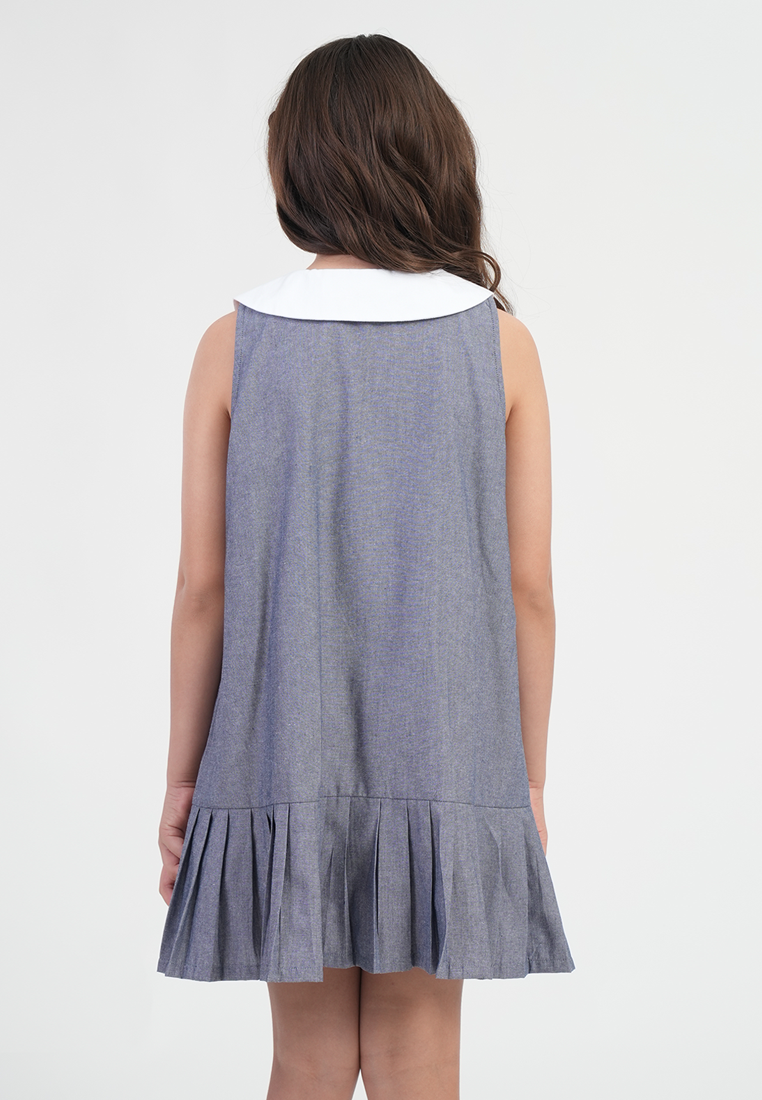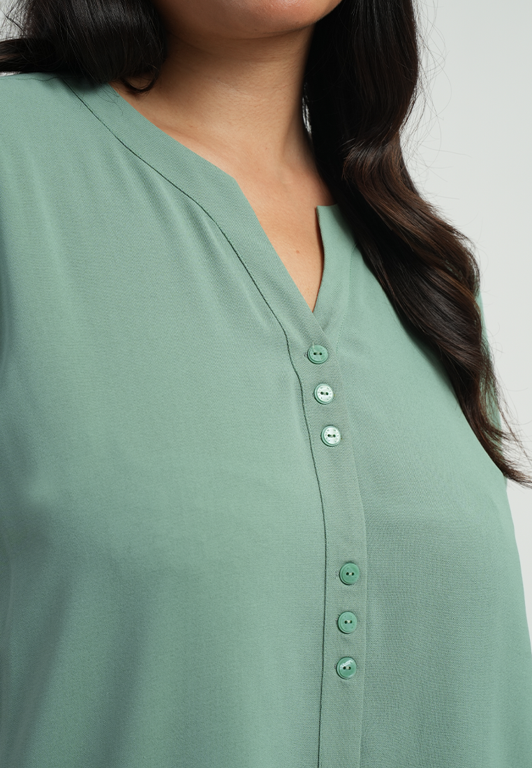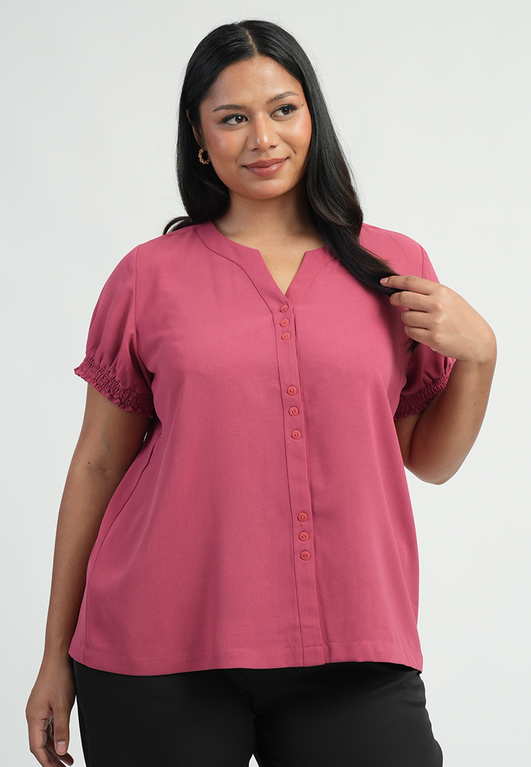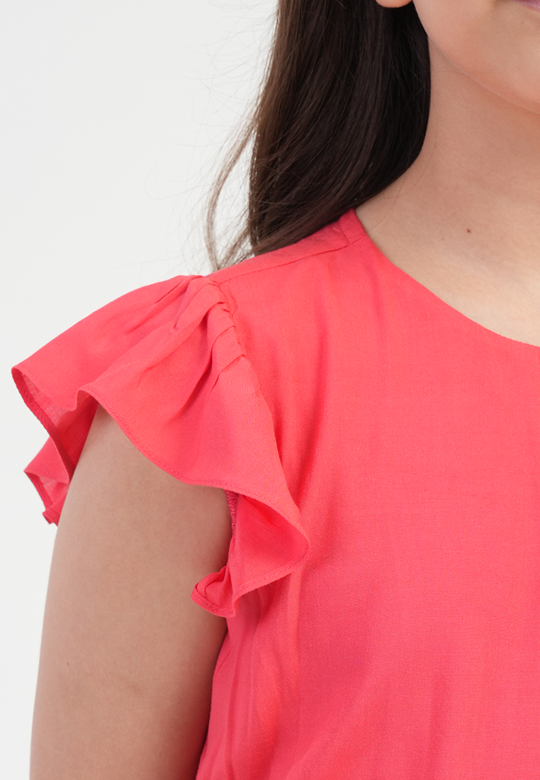 Details - V-neckline with ruffle collar detail, short sleeves, button-down front bodice, and a tiered hemline