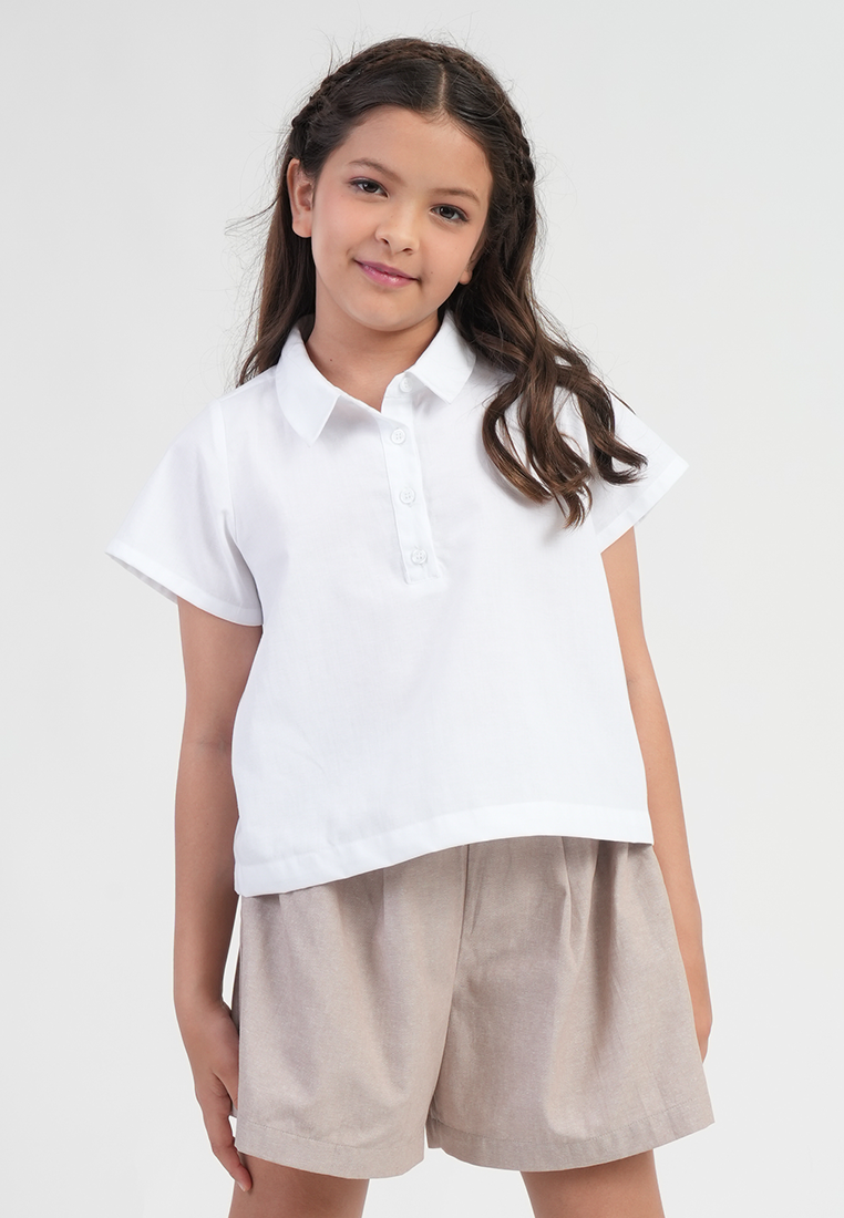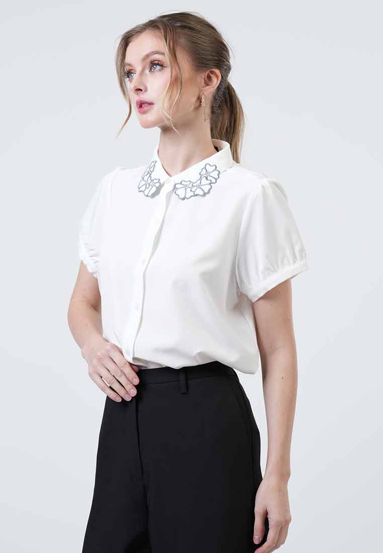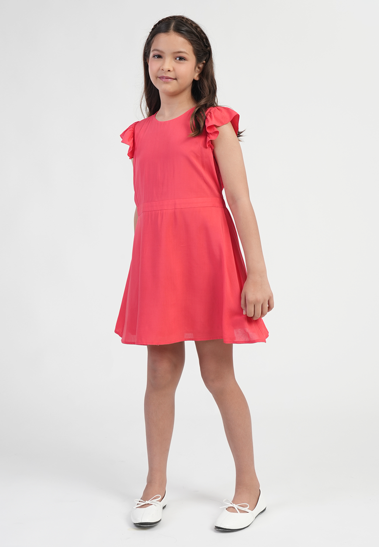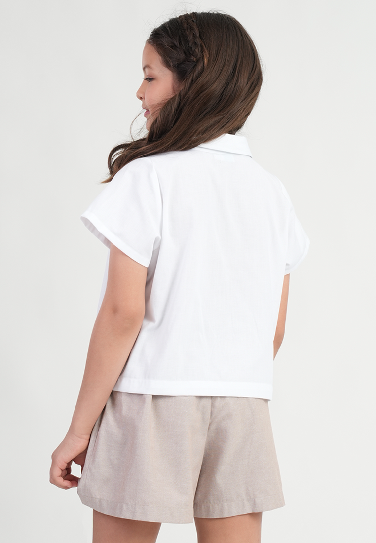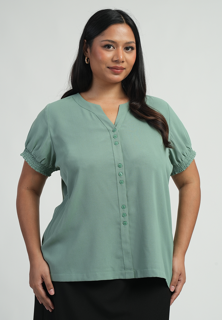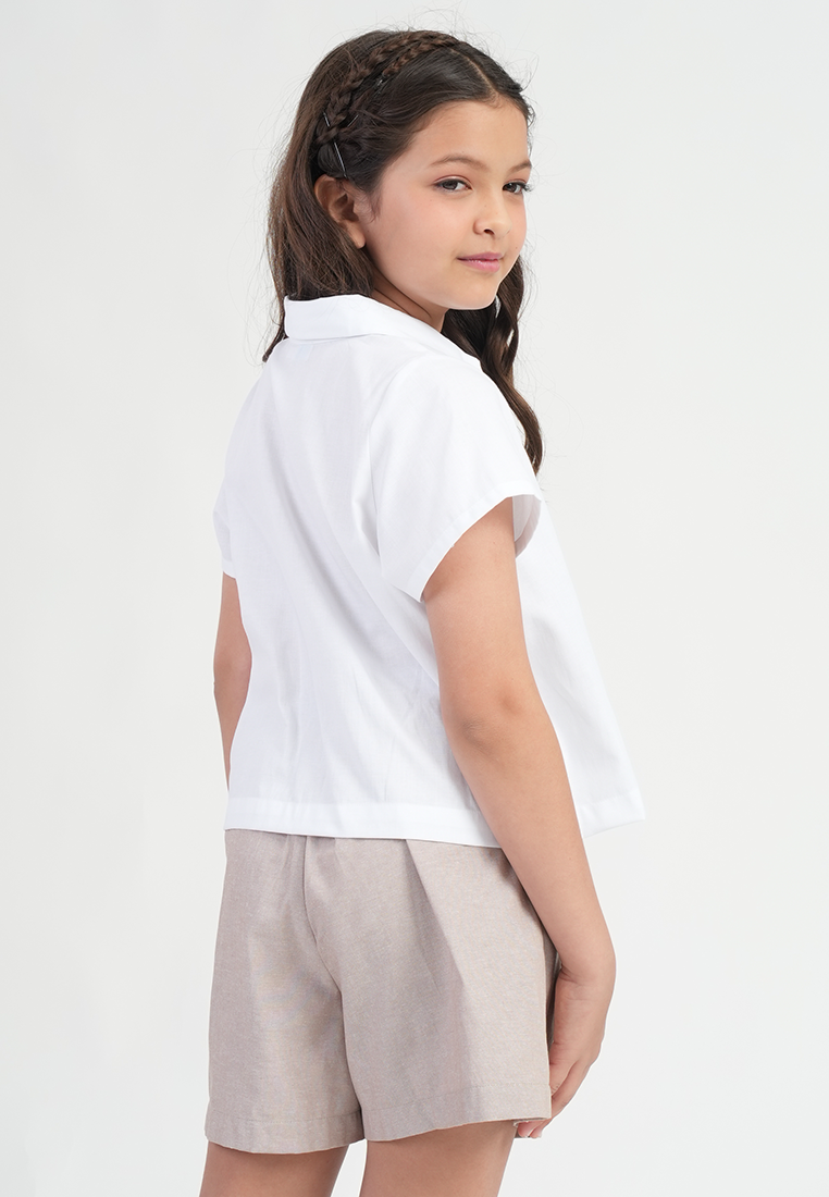 Details - V-neckline with ruffle collar detail, short sleeves, button-down front bodice, and a tiered hemline