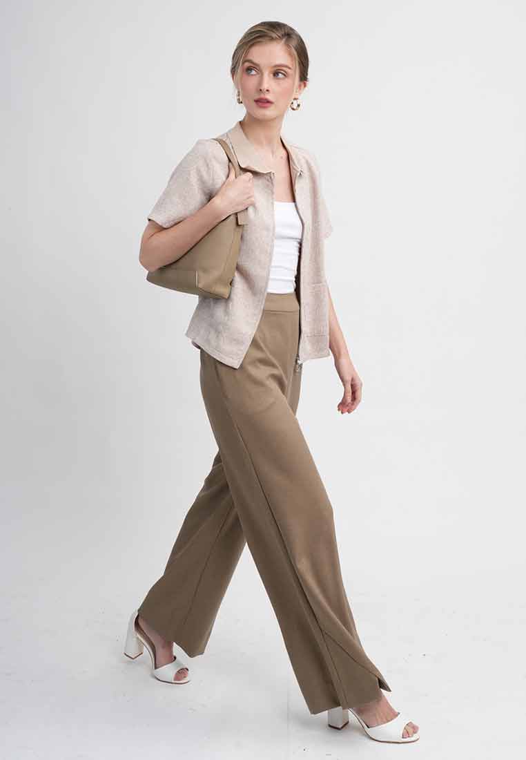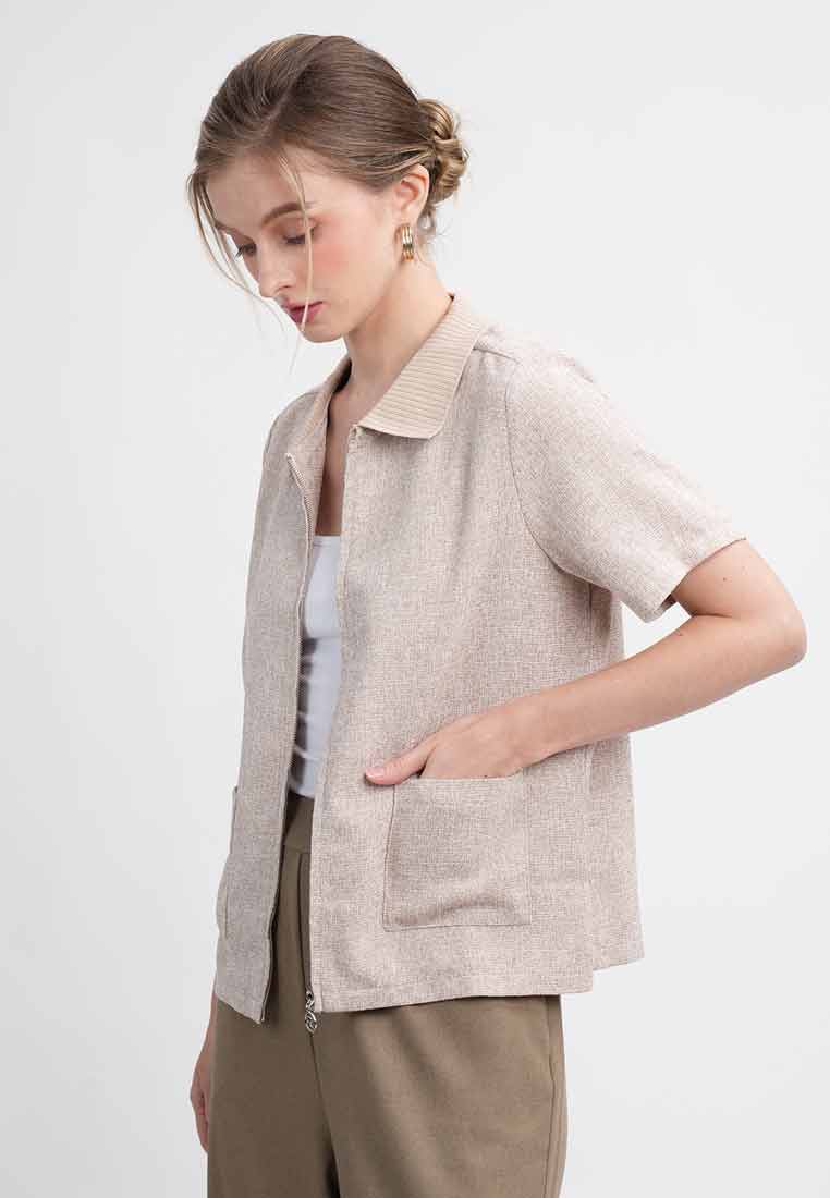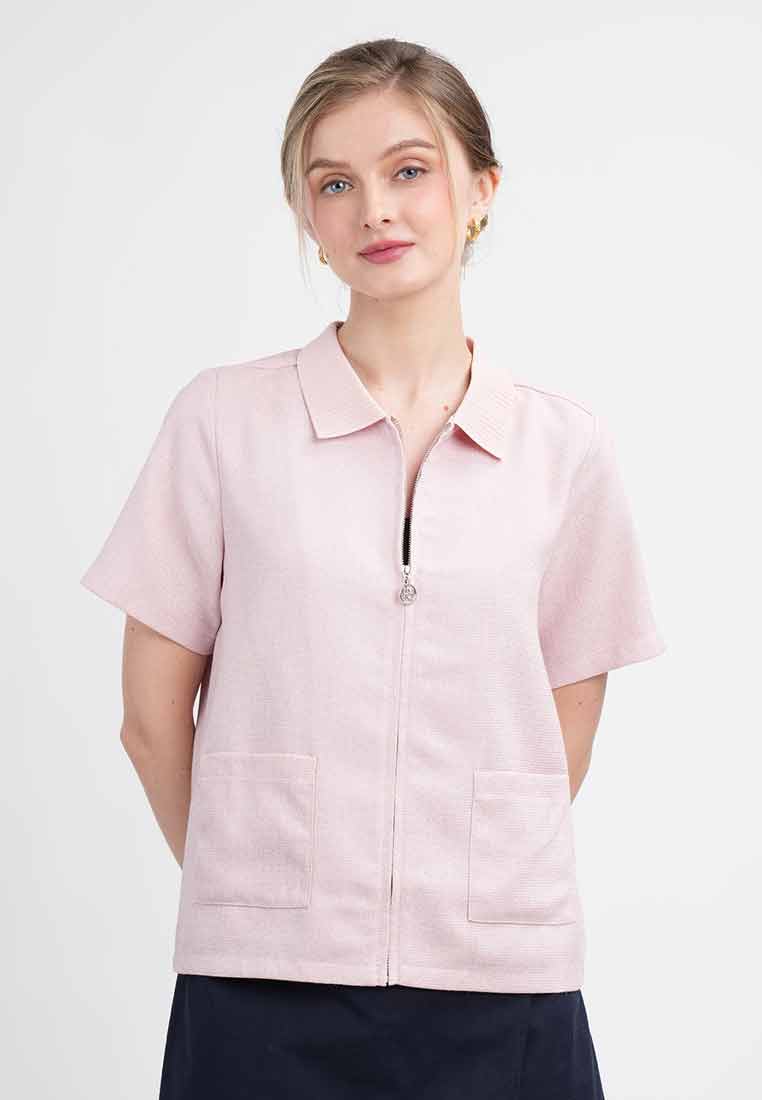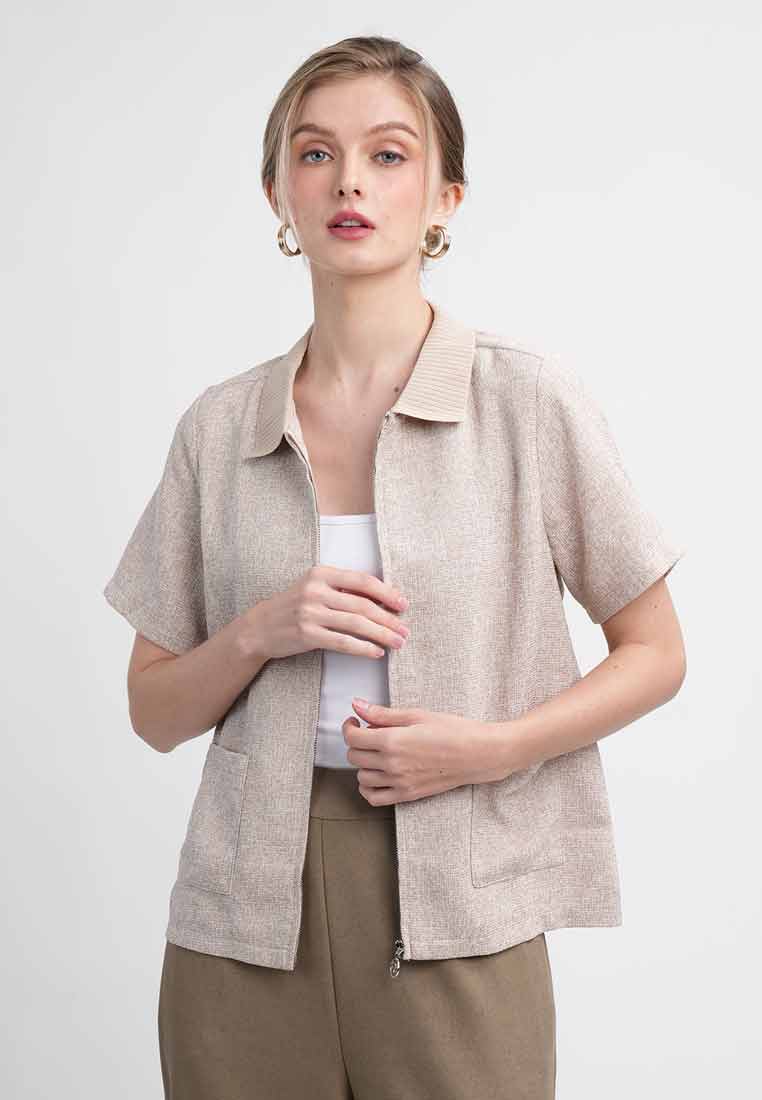 Meet the Amara Knitwear Zip-Up Collared Top—a stylish, modern piece that blends the casual comfort of knitwear with a structured, professional look. This top is crafted from a cozy, textured knit fabric and features a sharp, rib-knit polo collar. The full-length front zipper, finished with a chic circular pull, offers versatile styling options, allowing you to wear it zipped as a structured top or unzipped for a light, layered look. Functional patch pockets add a practical, contemporary detail. It's perfect for effortlessly adding a sophisticated structure to any smart-casual or office ensemble.