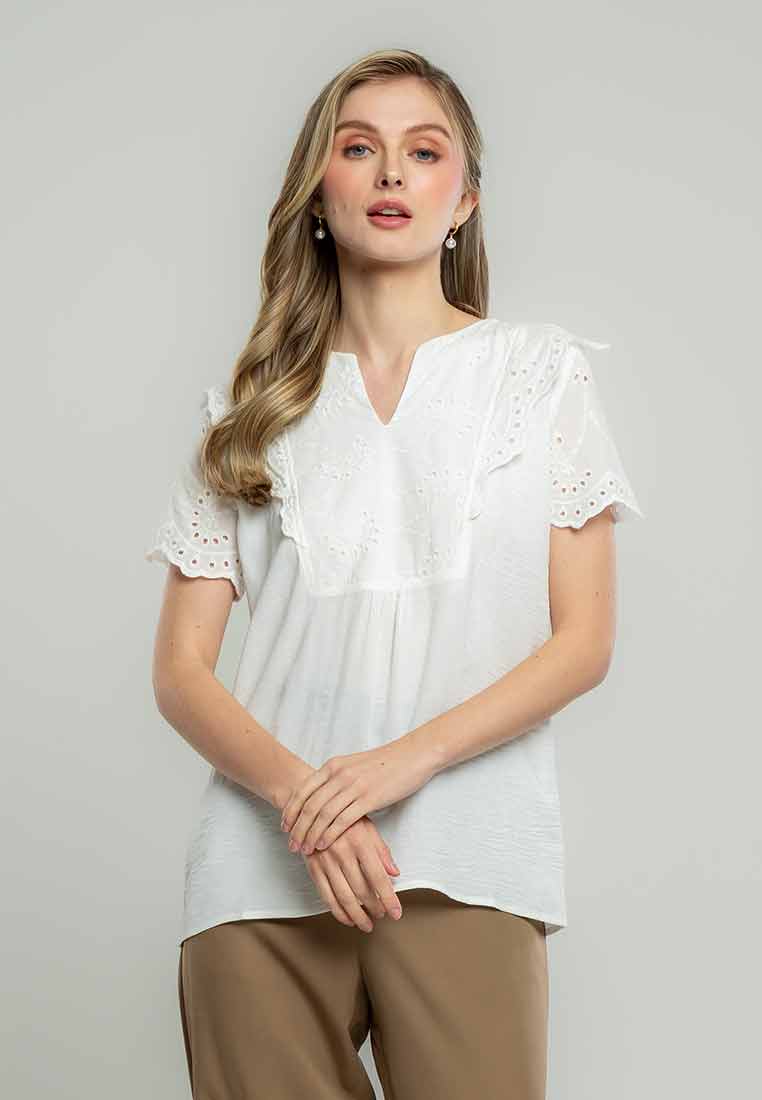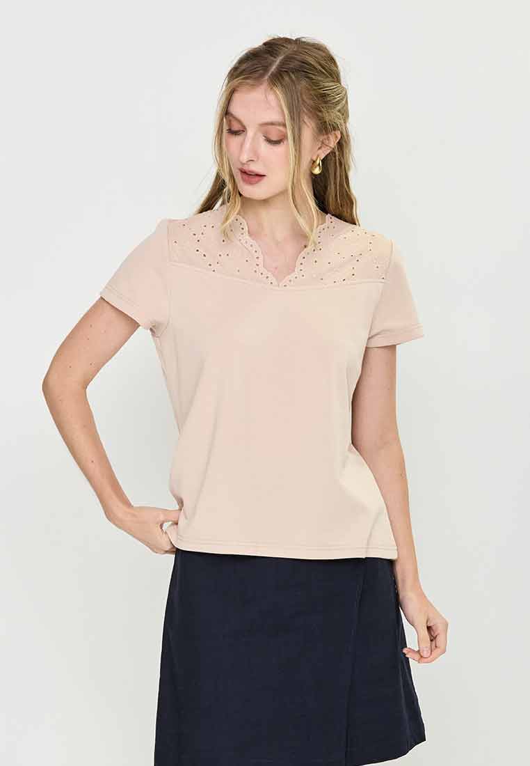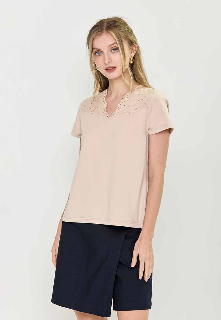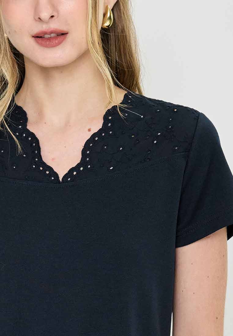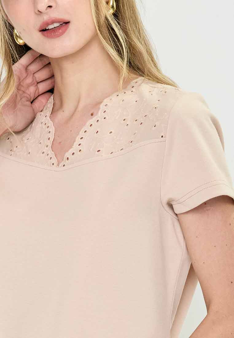 This smart casual knit top features a flattering V-neckline and short sleeves adorned with delicate cotton eyelet accents. Soft and breathable, it offers a perfect blend of comfort and subtle elegance for everyday wear.