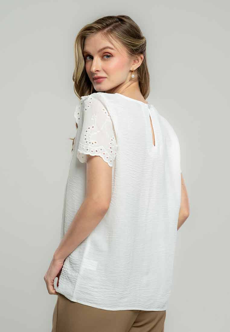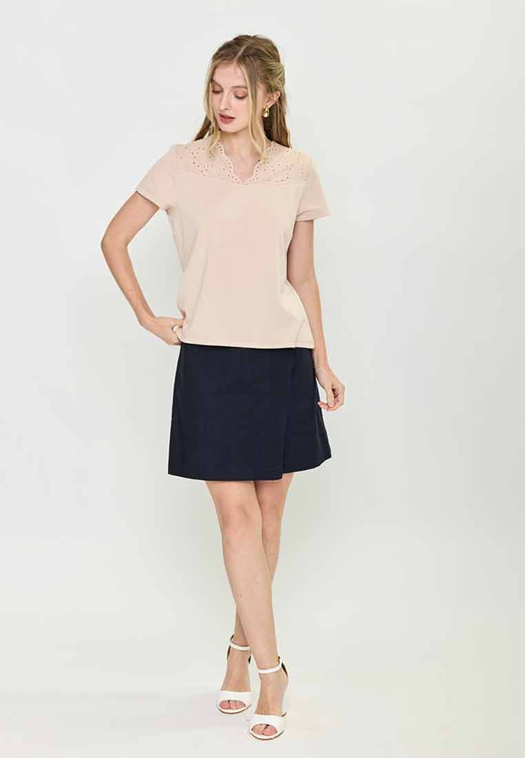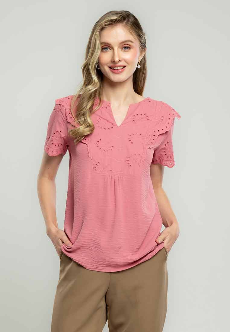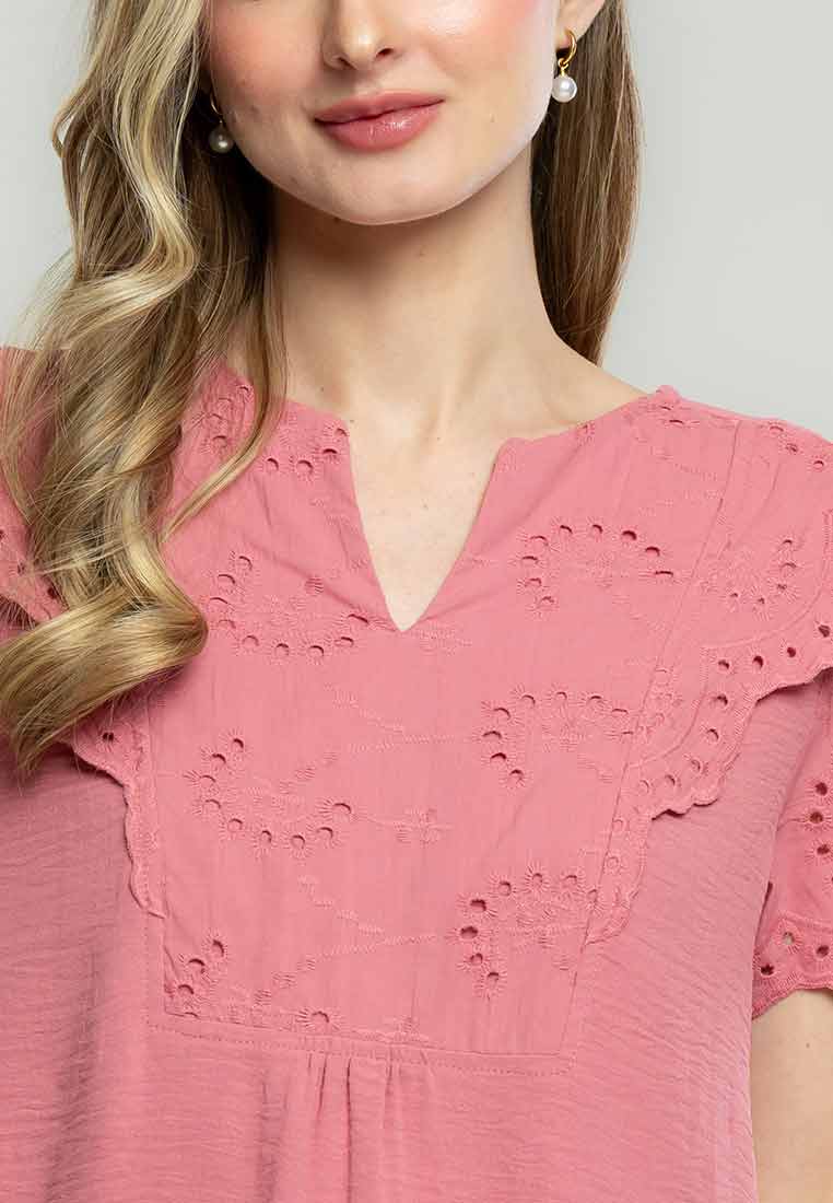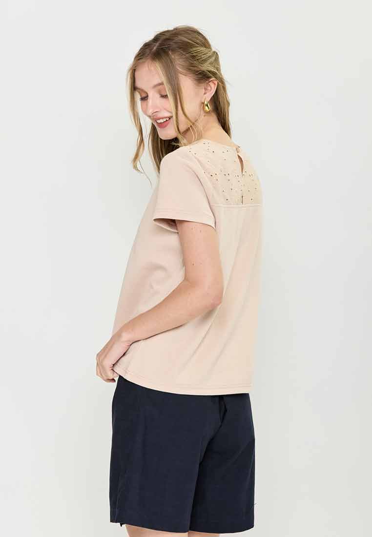 This smart casual knit top features a flattering V-neckline and short sleeves adorned with delicate cotton eyelet accents. Soft and breathable, it offers a perfect blend of comfort and subtle elegance for everyday wear.
