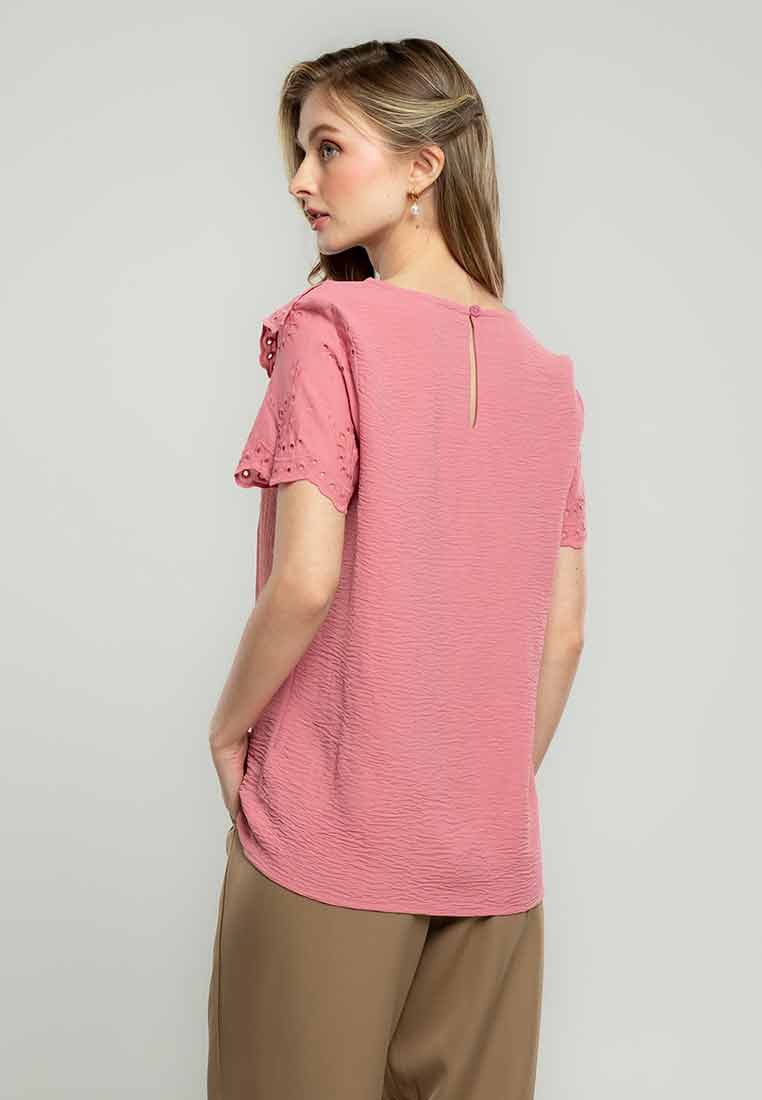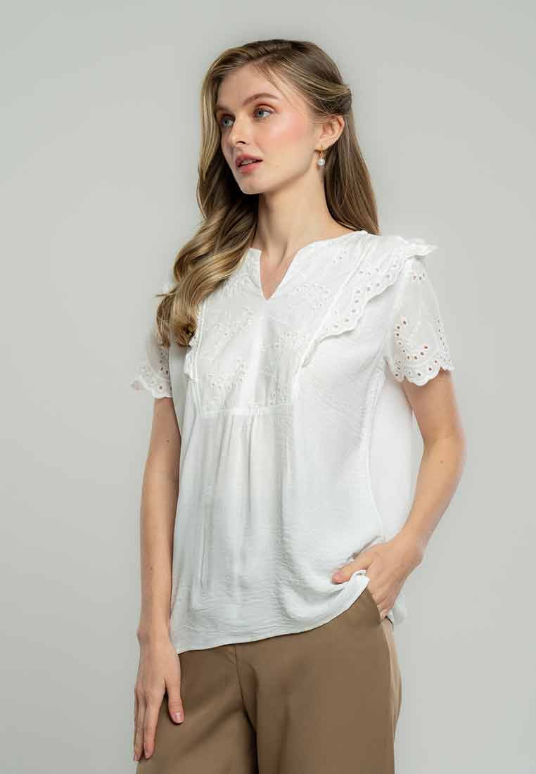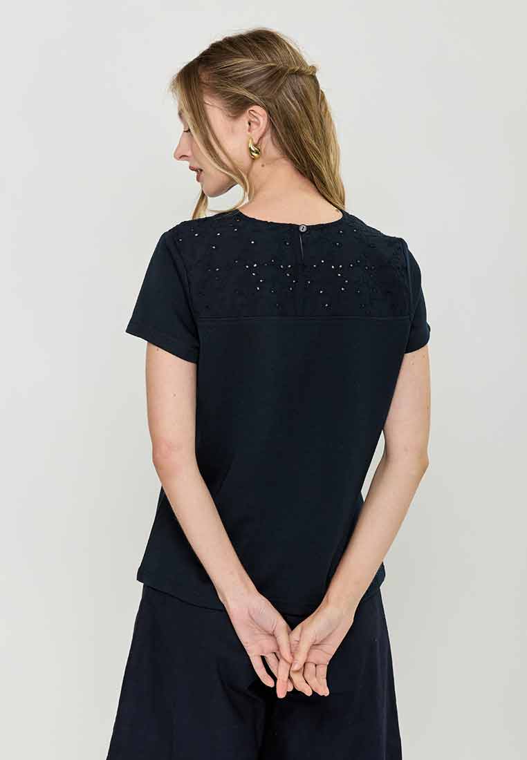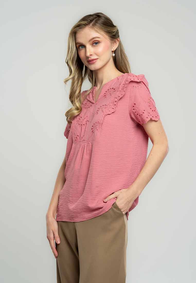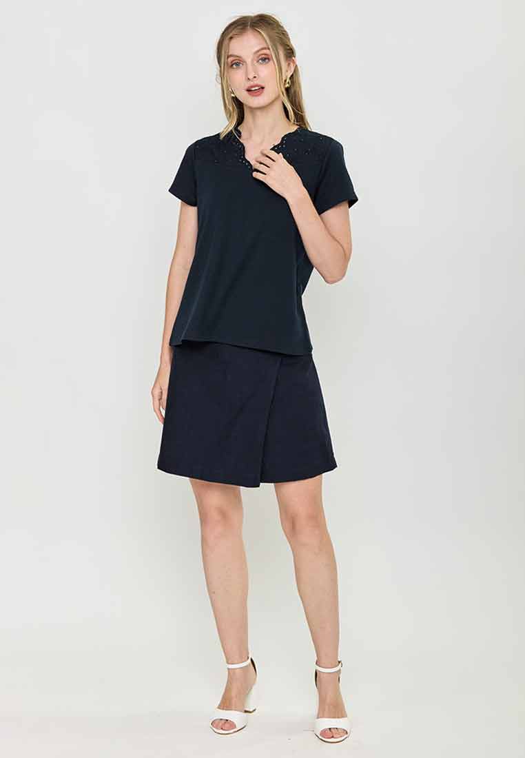 This smart casual knit top features a flattering V-neckline and short sleeves adorned with delicate cotton eyelet accents. Soft and breathable, it offers a perfect blend of comfort and subtle elegance for everyday wear.