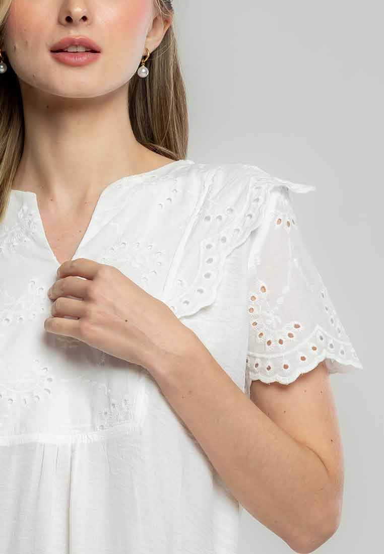 Details - Standout ruffled eyelet yoke and sleeves, subtle V-neck cut and gathered front bodice.