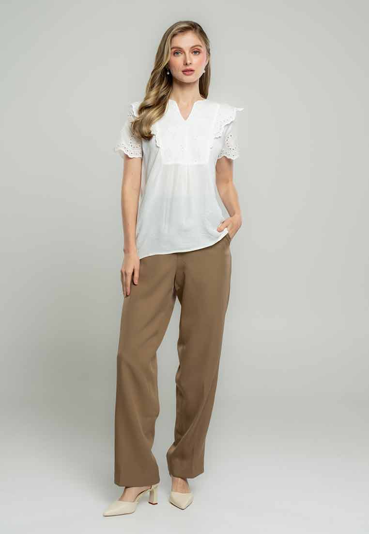 This embroidered cotton blouse is the perfect blend of timeless style and modern comfort. Featuring intricate eyelet details on the yoke and flutter sleeves, it’s crafted to bring a soft feminine touch to any wardrobe. The relaxed fit and breathable fabric make it an easy choice for everything from workdays to weekend outings.